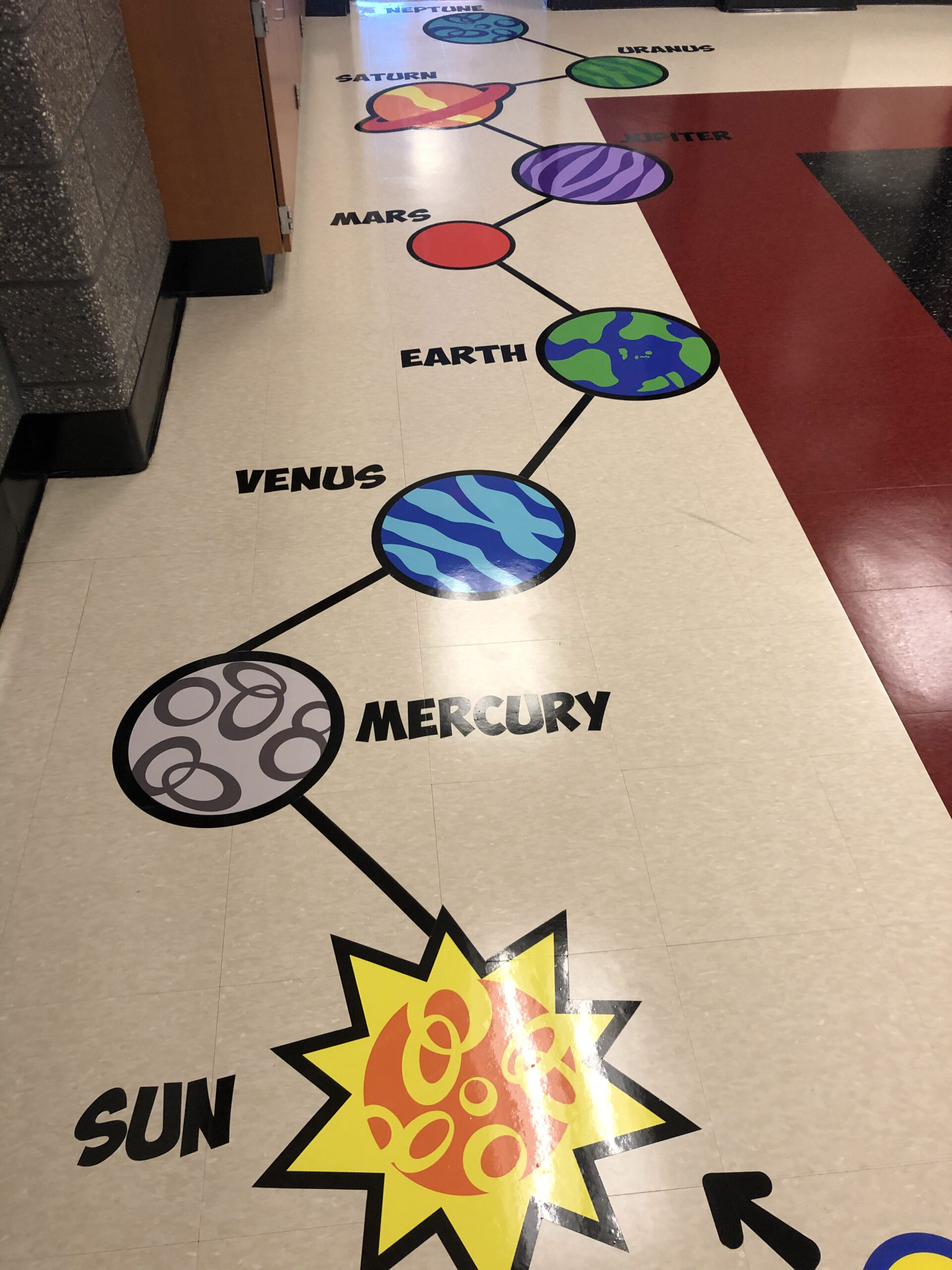 Students can use the path individually on an as needed basis or as an entire classroom. The pathway that was chosen because it features a solar system theme and includes literacy and numerical concepts, as well as a nature themed pathway requiring students to hop, skip, jump, and touch their way through the solar system.