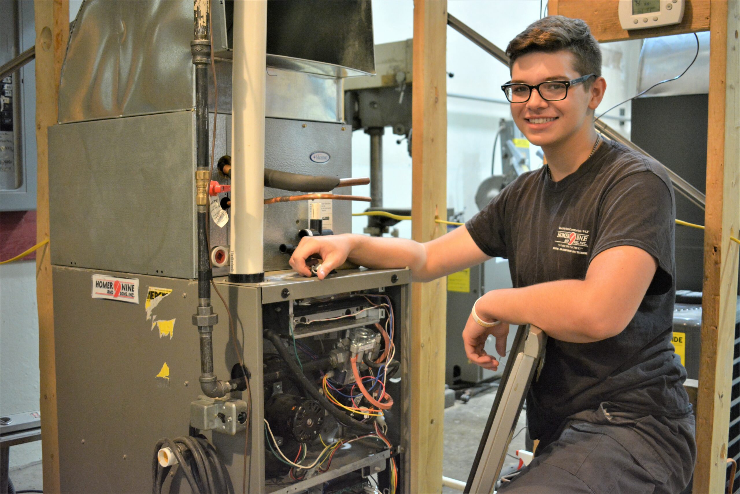 Western Beaver senior, Brennden Dixon, is currently enrolled in BCCTC’s HVAC/R program. This is his second year in the program but he made quite the impression to his instructor, Mr. Dan Ostronic during his first year. Once Mr. ‘O’ realized Brennden’s hard-work ethic and true desire to want to understand the heating and air-conditioning field, it prompted him to contact, Homer Nine & Sons, Inc. (Homer 9) out of Bridgewater, to see if they would be interested in a summer intern. Guess what? They were. Over this past summer, Brennden went to work installing both air conditioning and furnace units, plus he serviced many A/C units, supervised by experienced technicians of the local company. It may be hard to believe, but this was Brennden’s very first job and he couldn’t be happier!