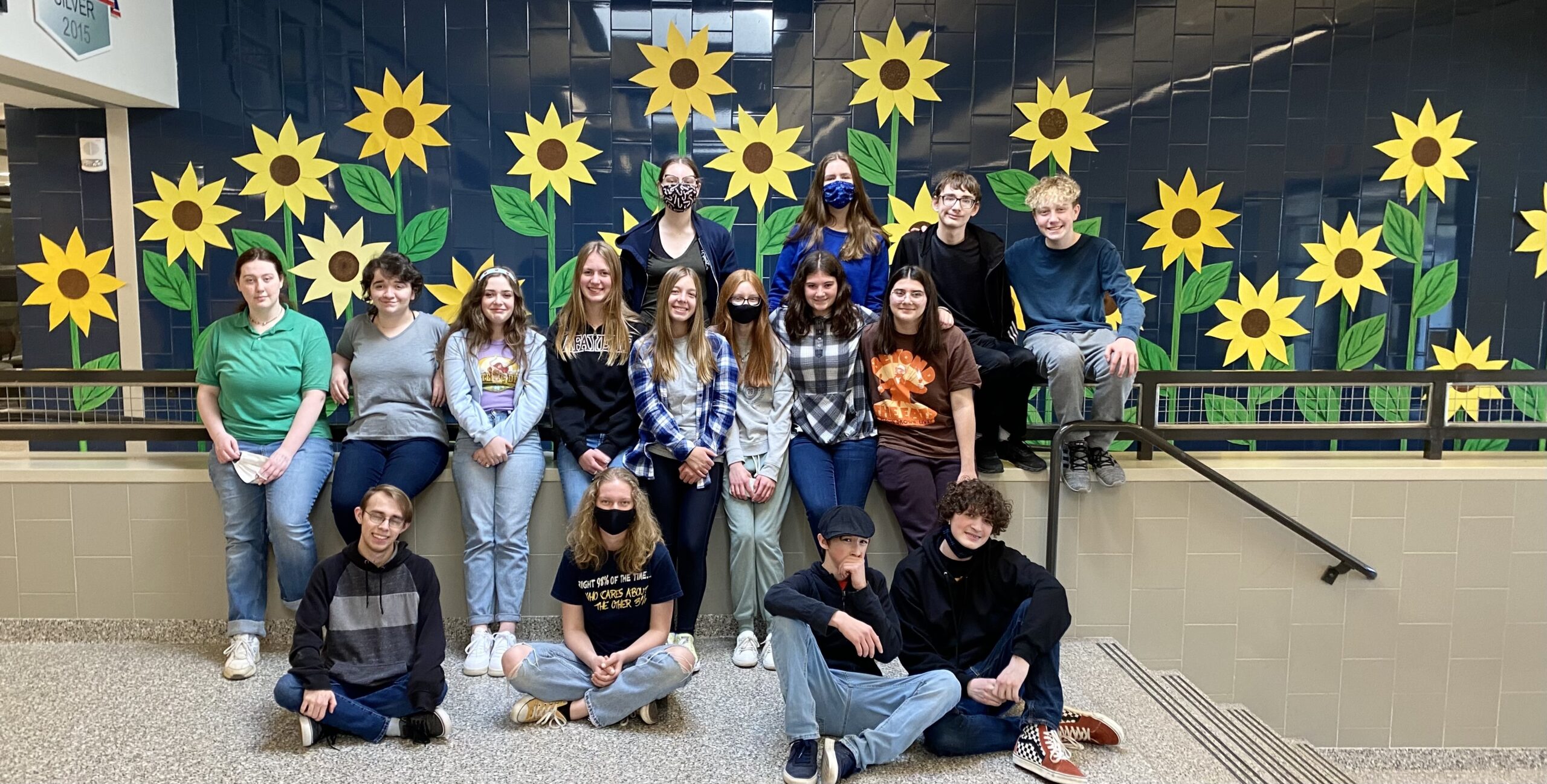 Members of the Quakertown Community High School art club in front of a wall in the high school lobby they designed with sunflowers in support of Ukraine.Quakertown Community High School’s (QCHS) art club has decorated a wall in the school’s lobby in support of Ukraine.