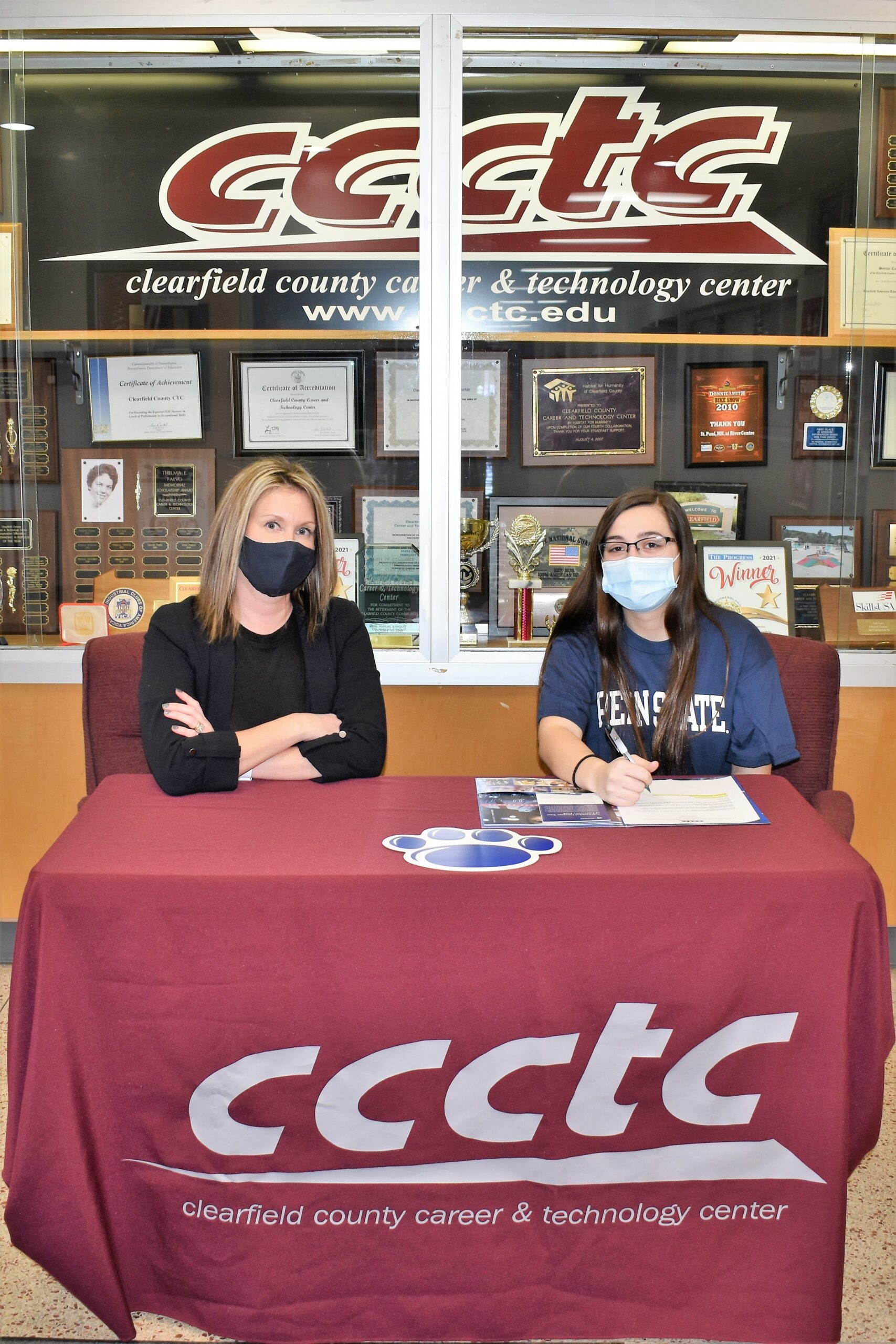 CCCTC Senior, Kara Coval, signs letter of intent during Career & Technical Letter of Intent Virtual Signing DayClearfield County Career and Technology Center (CCCTC) seniors have chosen to maximize their high school opportunities for career training and industry certifications, with an eye on becoming successful and financially secure much earlier in life. Career and Technical Education Signing Day is a way of recognizing their hard work and the value of the career-preparation training they have received through the CCCTC. In photo, seated, is Kara Coval, West Branch Area High School who will be attending Penn State University at Altoona in the College of Nursing. Seated with Kara is Tiffany Cover, CCCTC Principal and Assistant Director.