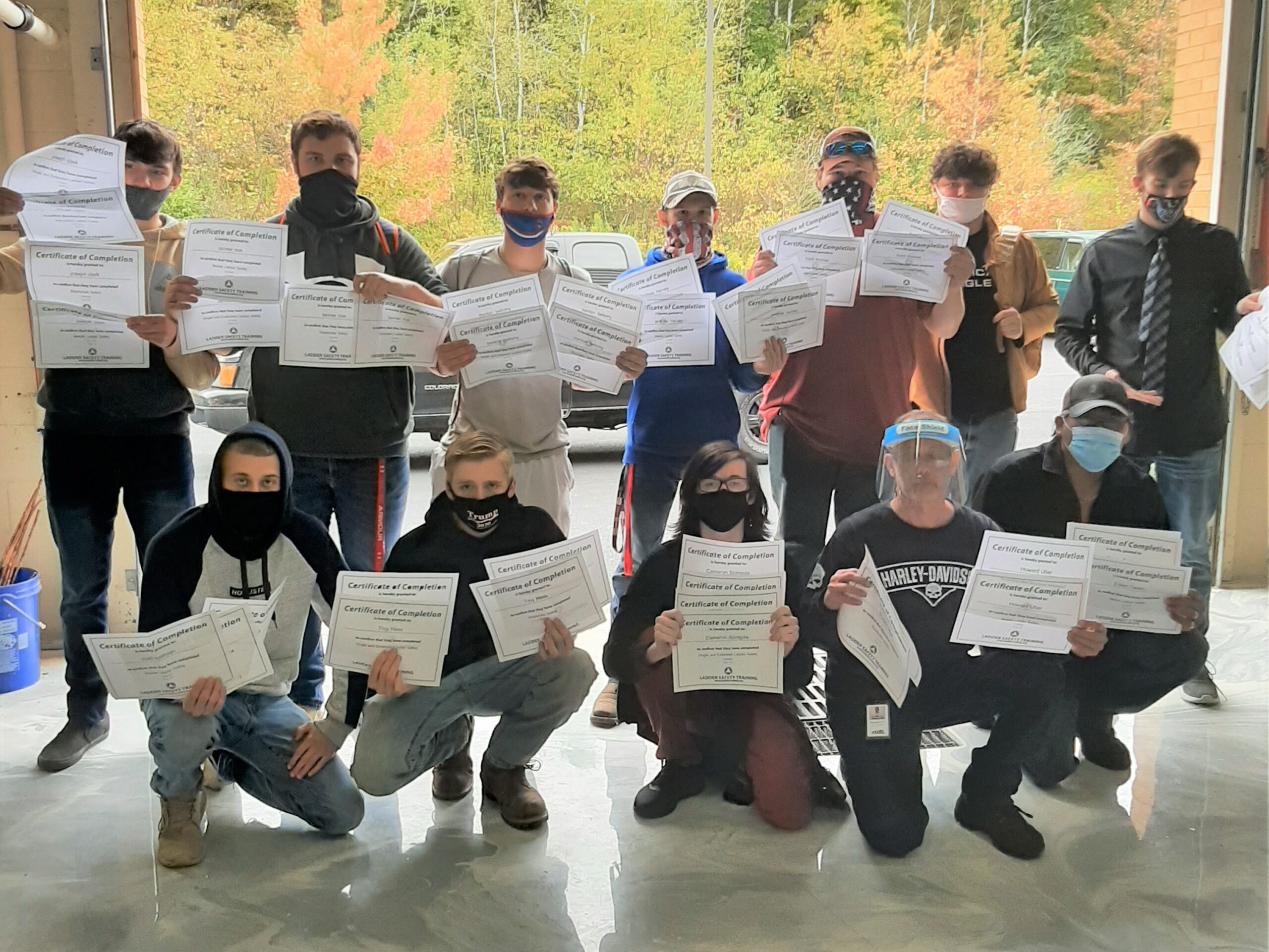Front row from left to right: Matthew Hallman, Moshannon Valley Area High School; Troy Hess, Clearfield Area High School; Cameron Spingola, Philipsburg Osceola Area High School; Howard Uber, Adult Student; and Edwin Castro, Adult Student. Back row from left to right: Joseph Clark, Clearfield Area High School; Tanner Rice, West Branch Area High School; Trenton Bellomy, West Branch Area High School; Andrew Harvey, Clearfield Area High School; Franklin Thomas, West Branch Area High School; Chase Hummel, Clearfield Area High School; and Benjamin Crain, Philipsburg Osceola Area High School.Despite COVID restrictions, students at Clearfield County Career and Technology Center are continuing to pursue their career goals. CCCTC’s Heating, Ventilation, Air Conditioning, and Refrigeration (HVAC/R) students completed all four of their Ladder Safety Certifications through the American Ladder Institute Ladder Training. These certifications are very important in the industry when working on commercial heating and cooling systems. HVAC/R technicians often find themselves in some fairly high environments, whether they are on top of a roof or on a ladder accessing ductwork or vents in a ceiling or attic space.