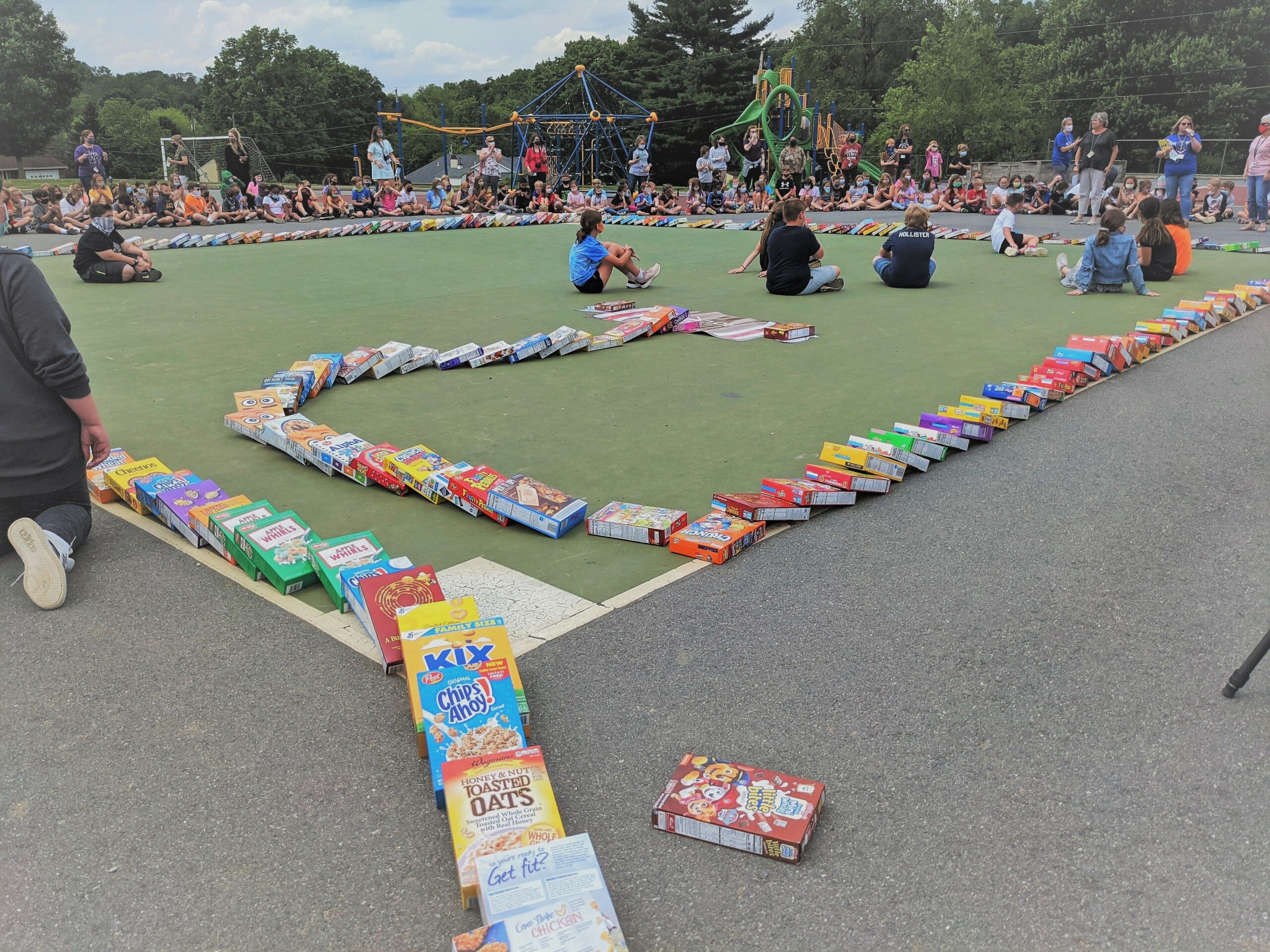 Conestoga students, staff and family members donated the cereal throughout the month of May. Corl posted a running total of the number of boxes collected in the school lobby to inspire the students, and she enlisted 15 fifth-graders to help set up the event and make sure it ran smoothly. They kept watch to make sure the boxes didn’t blow over and stepped in to assist when the domino train hit a snag.