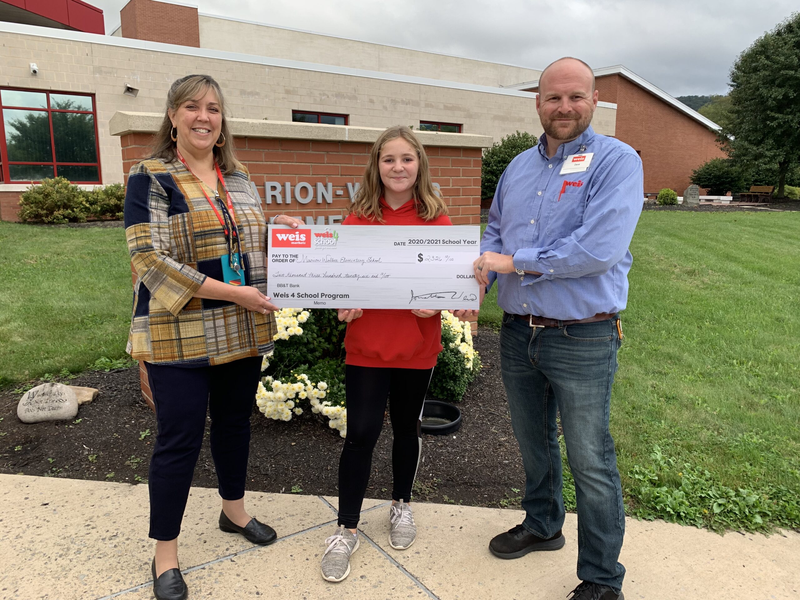 Through the Weis 4 Schools program, Marion-Walker Elementary School received a $2,326.10 donation. A check was presented to the school on September 21 by store manager Dave Barnard and his fifth-grade daughter Camryn who also attends the school.