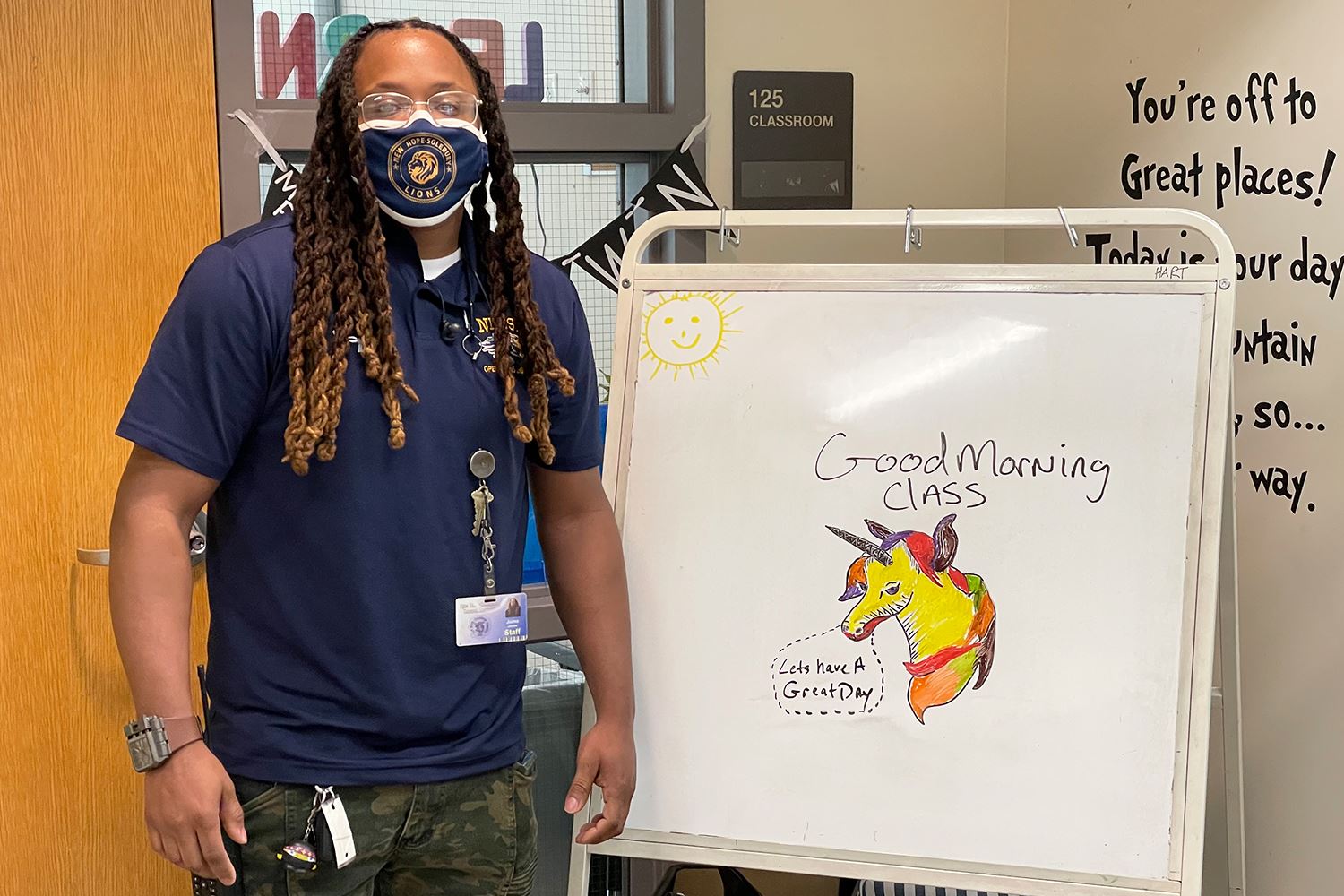 Juma JonesThird grade students in New Hope-Solebury’s Upper Elementary School have a new source of inspiration when they come into the classroom each morning: a colorful work of art created by school custodian Juma Jones. Mr. Jones, who has been helping to ensure the school classrooms are impeccably cleaned and ready for student learning in a pandemic, first started creating the drawings when he overheard the students expressing anxiety about their upcoming PSSA testing.