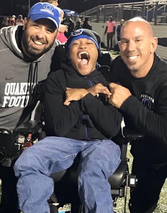 Gabe DaCosta (center) with head football coach George Banas and assistant coach Chris LemuellGabe DaCosta, one of the most popular students at Quakertown Community High School, is highlighted in the November 1 Eagles Gameday Magazine. The profile explains how Gabe developed cerebral palsy from his premature birth and now spends most of his time in a wheelchair. It also reveals details of his charming personality, including his “expressive eyes and rumbling laugh.”