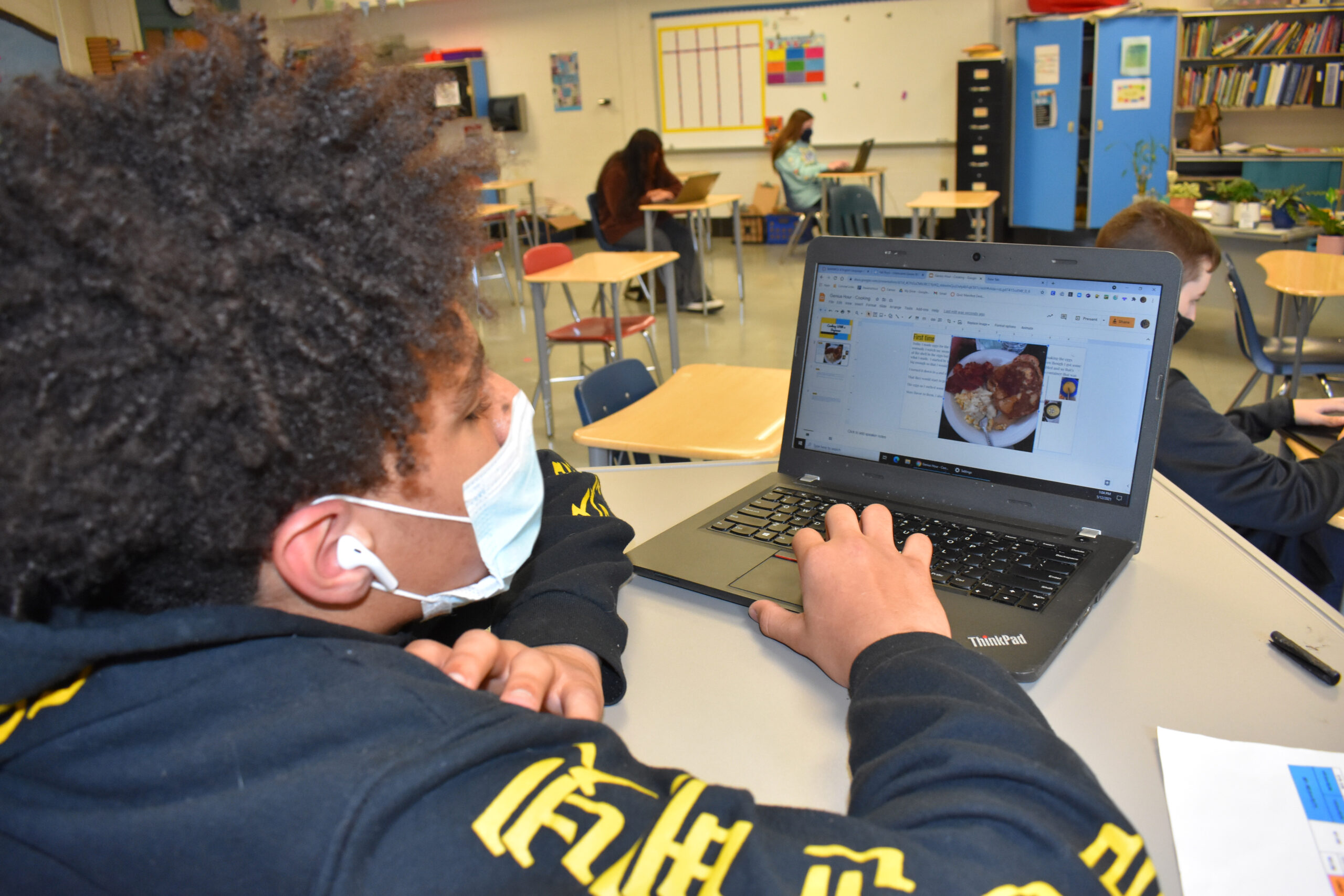 CMS eighth grader Marcus Laffredo works on his blog about learning to cook.Most middle school students have interests outside of the classroom that they either already know a lot about or would like to learn more about. This was the starting point for the Genius Hour project for the eighth graders in Mrs. Warwick’s English Language Arts class at Colonial Middle School (CMS). “It’s about becoming a genius in something or, if you’re already a genius, teaching what you already know,” said CMS eighth grader Marcus Laffredo, who was working on a blog about learning how to cook.