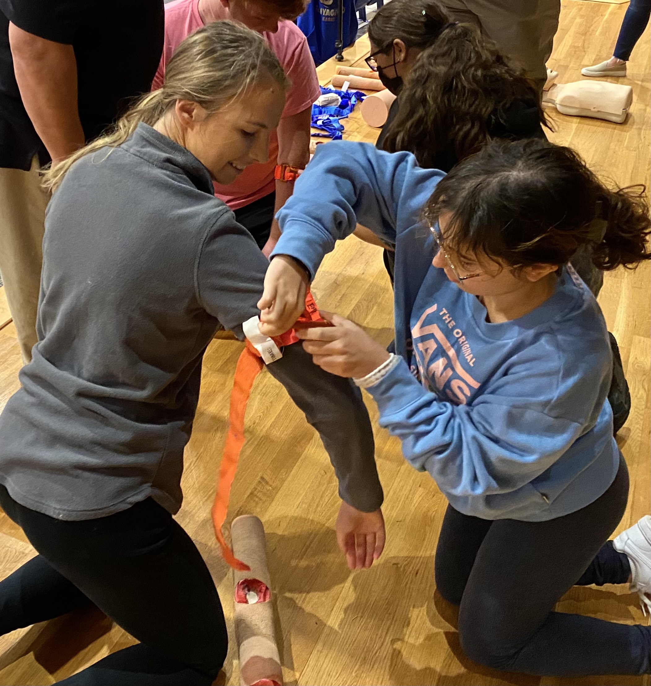 A Quakertown Community High School student is taught how to use a tourniquet by a Lehigh Valley Health Network emergency official.Professionals with the Lehigh Valley Health Network’s Emergency Medicine Institute spent a lunch period with Quakertown Community High School (QCHS) students as part of the Career Pathways Speaker Series. The five LVHN employees (two of whom graduated from QCHS) spoke about their careers and then worked with the students on CPR and Stop The Bleed training. This session is part of the STEM and Computer Science Pathway, though all students are invited to attend.