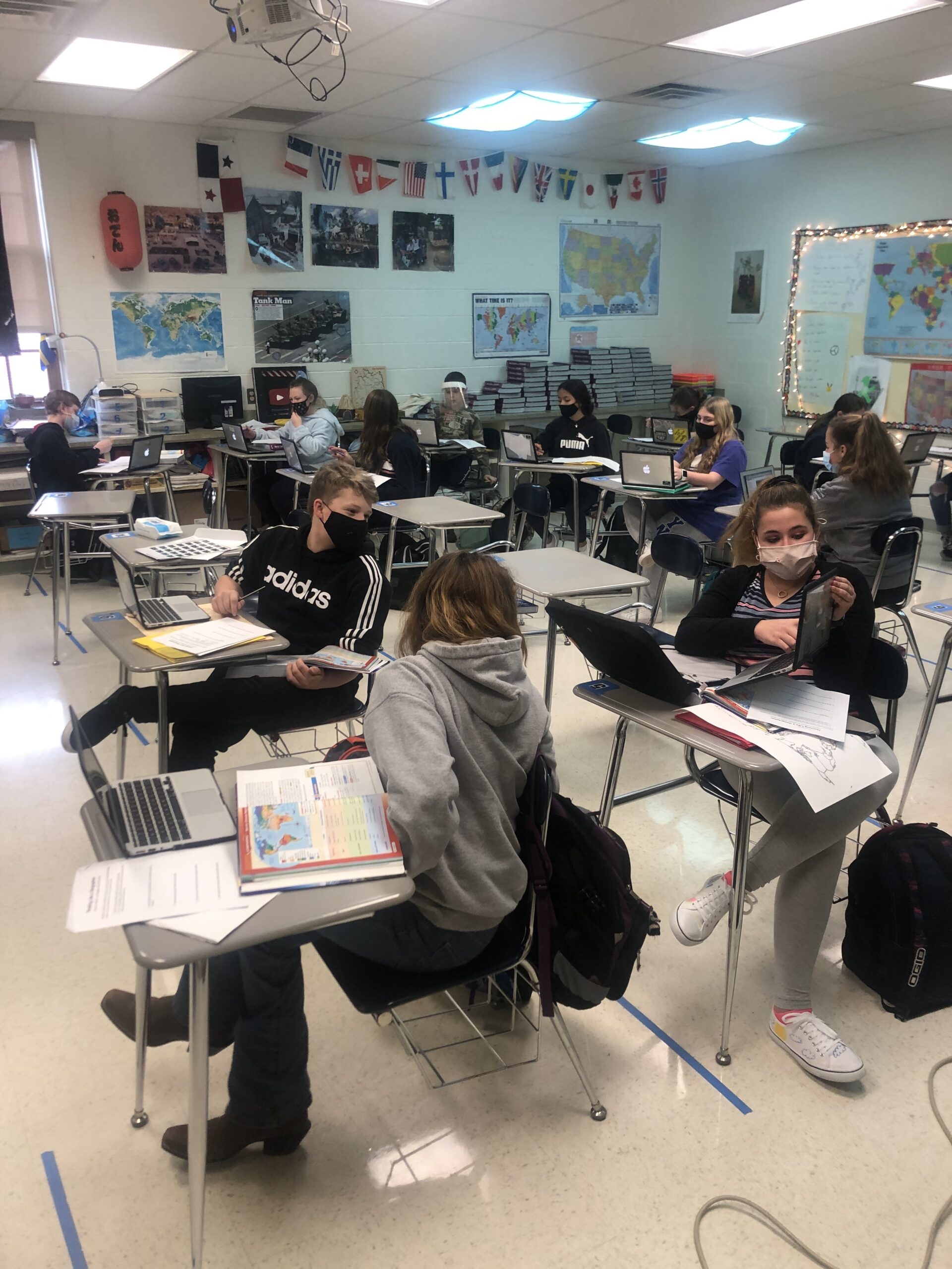 Families Around the WorldSocially distanced group work in a Oley Valley seventh grade geography class involved learning about other cultures. Groups examined and analyzed pictures of families from around the world and their groceries for a week. Students plotted the families’ location on a map, determined the locations’ climate, and discussed whether the families’ climate impacted the food they ate. The cost of the groceries was also listed on the picture. Students were amazed at how cheap it was to feed a family of 13 people in Bhutan ($5.13) and how expensive it was to feed a family of five in Norway ($719.49).