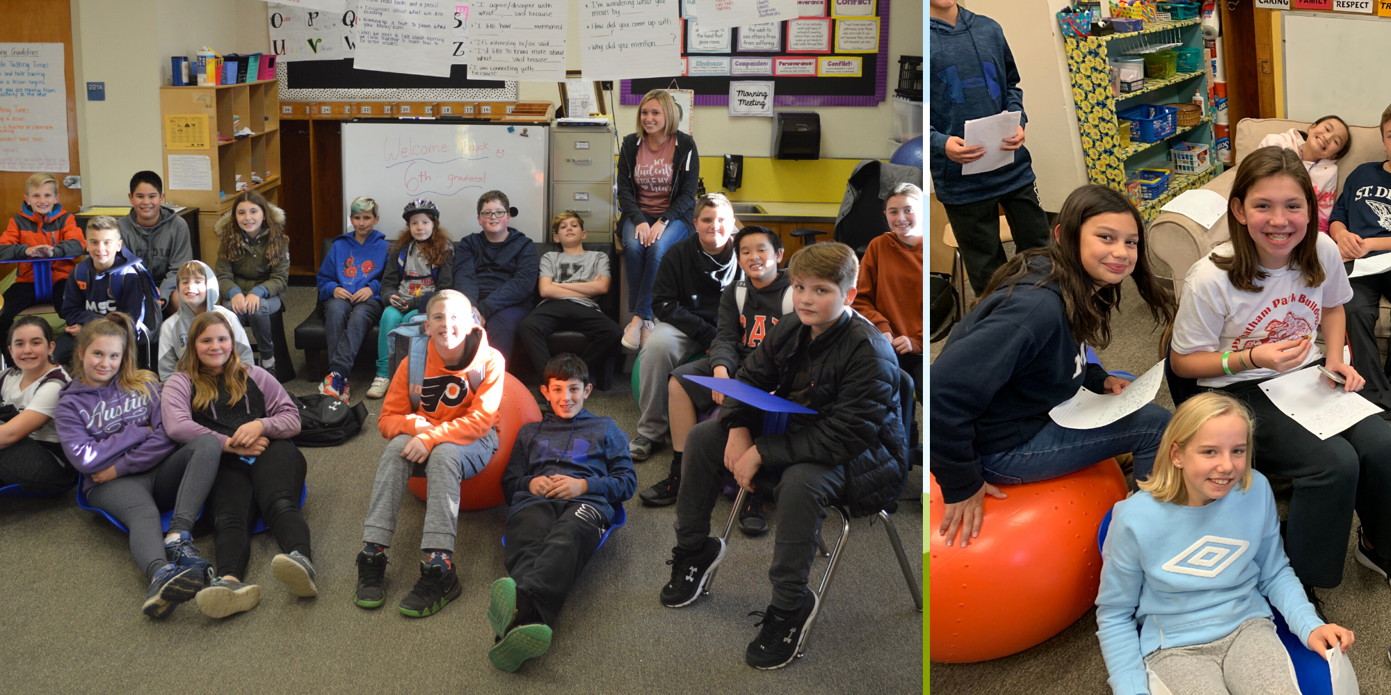 Fifth-grade students can be very persuasive! Last spring, as part of the persuasive writing unit, students researched flexible seating in learning environments and wrote a collaborative persuasive letter to the Haverford Education Foundation. With support from their teachers, the grant was approved. The current fifth grade Language Arts classrooms at Chatham Park Elementary now have communal workspaces with various seating options around the classroom. Students can choose a workspace with alternative seating options such as stools, cushions, raised tables, yoga balls, and mats. This flexible seating offers students the freedom to choose a communal area or work alone.