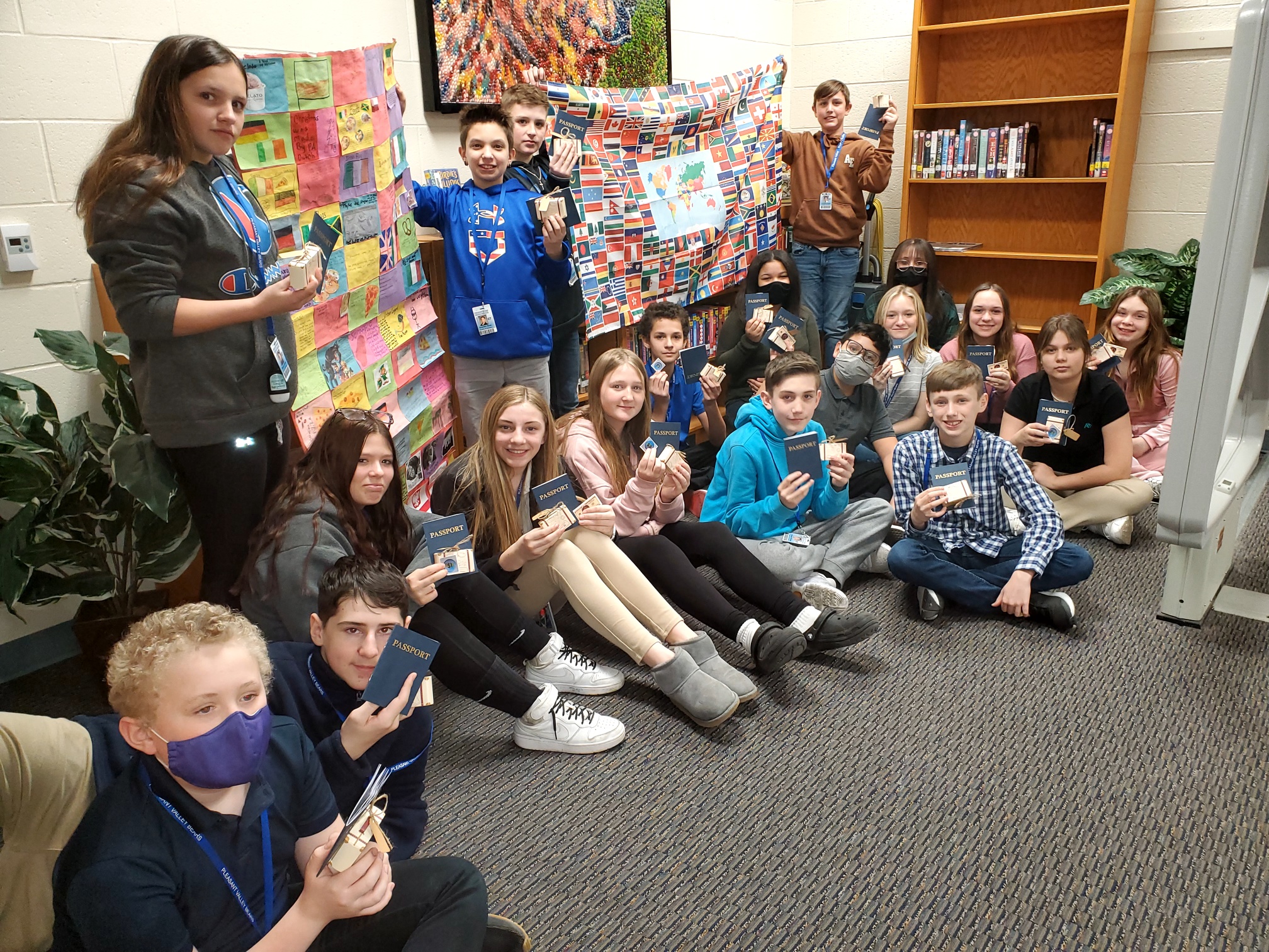 Students proudly display the class culture quilt and flags of the worldPleasant Valley Middle School Spanish Teacher Stefanie Santiago bid farewell and safe travels to her first Global Connections class. She sent them off with their passports and suitcases, filled with gum to chew to pop their ears on the airplane along with a few other treats. They proudly displayed their class culture quilt and the flags of the world. Throughout their 45-day exploration, Ms. Santiago helped her students become more open-minded, more curious, and more inclusive, thus shaping them into global citizens!