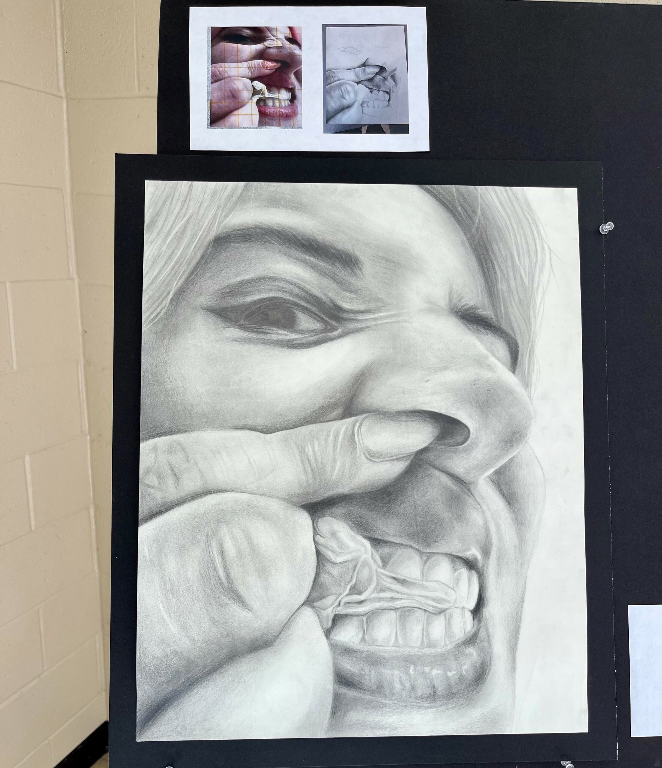On November 22, she explained a piece of her work on display that allowed her to delve into something she finds more difficult – working with shading on an investigative graphite drawing, which depicts a full-face view of herself featuring parts of her hands. An inspiration for the drawing came from the advice of a former art teacher who said, “if you master the detail of the hand, then it will be easier to do with the rest of the body.”