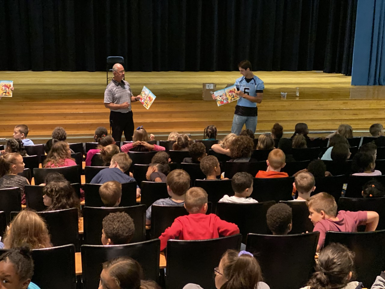 About 140 second-graders were assembled into the auditorium to hear their favorite football team, the Prexies, read to them. Washington High School Assistant Football Coach Lance Vallee has been working with the 2nd and 7 Foundation (a nonprofit started 20 yrs. ago by Ohio University football players who wanted to “pay it forward” and volunteer) to encourage high school students to be role models. For the past few years, Coach Vallee has taken senior athletes – football in the fall and other sports in the spring – to read to the second-graders at Washington Park Elementary School.
