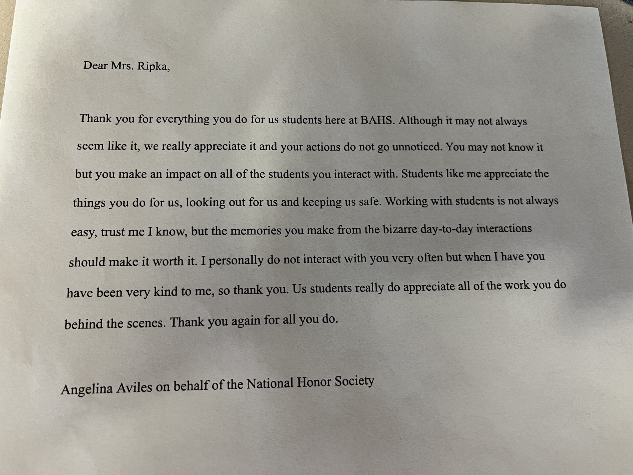 When faculty and staff arrived at work on March 29 at Bellefonte Area High School, many found notes left in their mailboxes from National Honor Society students thanking them for the positive effects they have on the lives of students, in addition to the work they do daily at school. It was a project about 50 students participated in with the goal of reaching out to various school employees, letting them “know their actions are not going unnoticed,” according to senior Angelina Aviles, the club’s president. “I think it is good to show appreciation (and) personally, I think it is nice to have others recognize what has and will be done,” she said. “Their efforts are leaving positive impacts on students. … We appreciate everything that they are doing for us.”