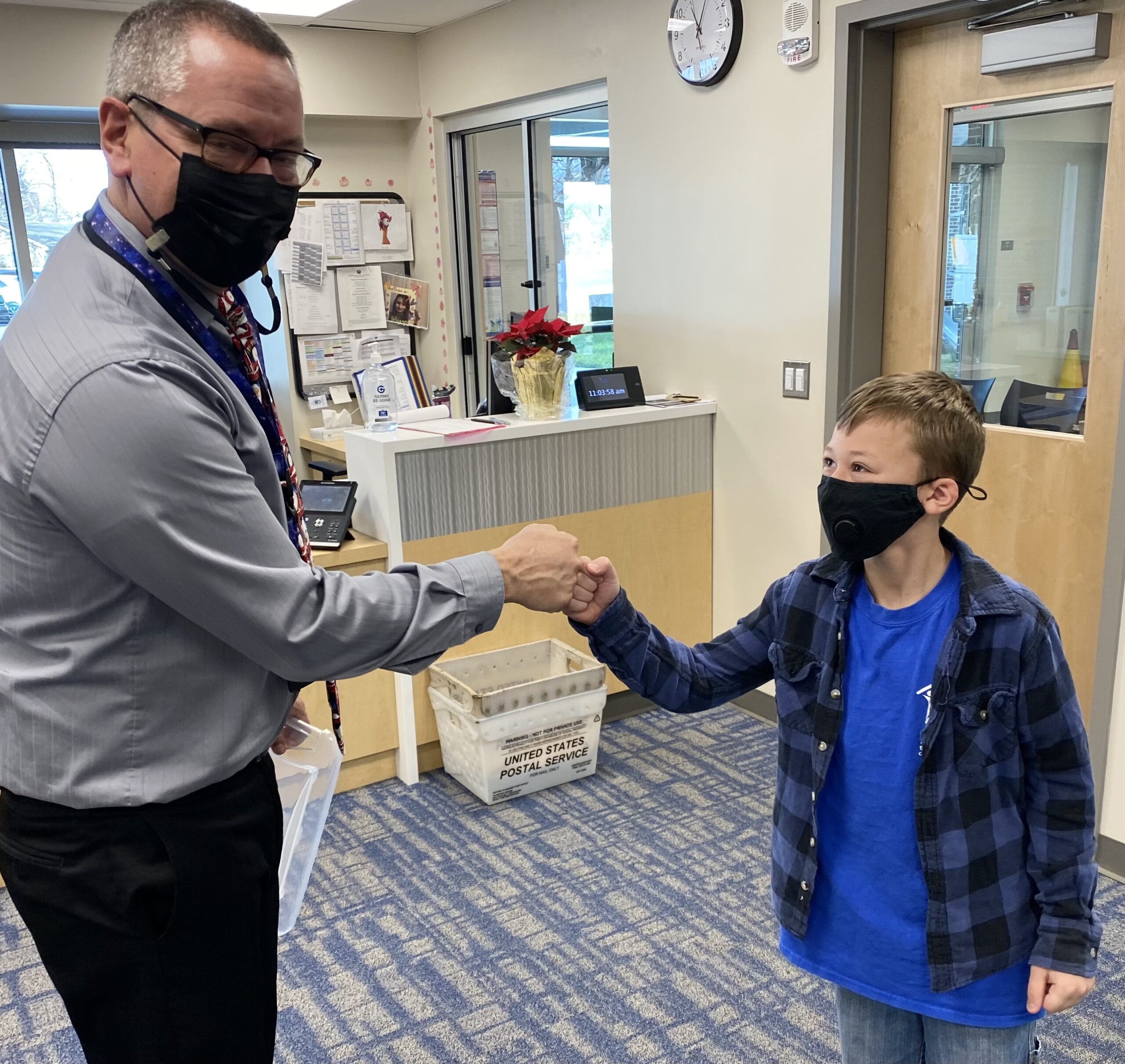 Caleb Byelich fist-bumps with Neidig Principal Scott Godshalk.Caleb’s Cocoa Cafe reopened last weekend, and the result is more than $4,500 raised for the Upper Bucks Code Blue Shelter, which aids the homeless.