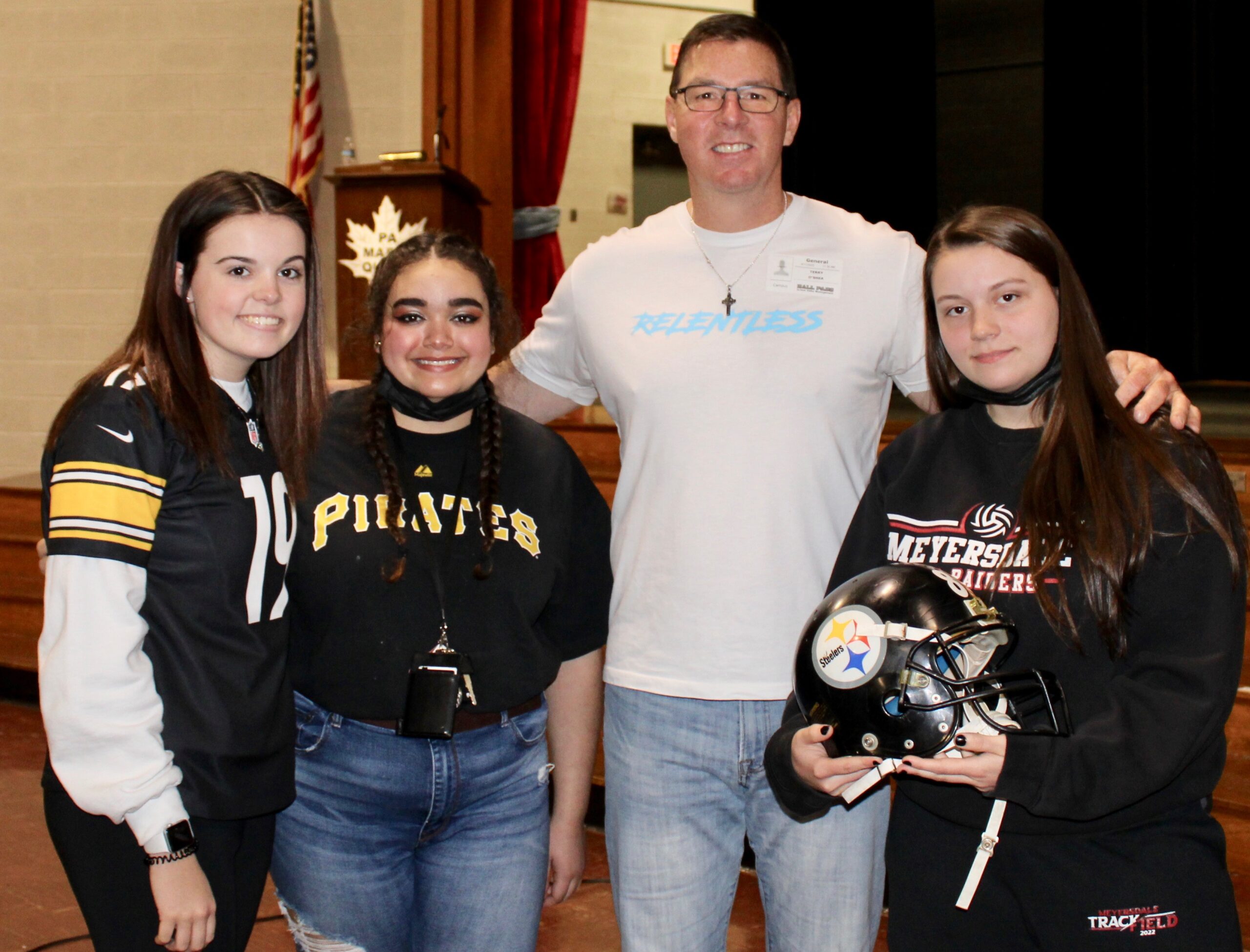 Members of the No Place for Hate Club at Meyersdale Area Middle and High School welcomed guest speaker Terry O’Shea on April 11. O’Shea is a former professional football player and spoke to students, in grades six through 12, about the need for perseverance and acceptance. Members of the club include Laurel Daniels, Chaddea Shoemaker and Linzee Emerick.The Meyersdale Area School District welcomed a special guest on April 11 as part of their efforts to make MASD a more inclusive and accepting environment for all students. Terry O’Shea, a former Pittsburgh Steeler, was the guest speaker for the No Place for Hate Club. No Place for Hate is a student-led organization created and implemented to help teach love, understanding, respect and acceptance for all students in the Meyersdale Area School District. With the assistance of History teacher Michael Swank, O’Shea was contacted and agreed to speak to students in grades six through 12 about the need for perseverance, acceptance and courage in order to succeed and thrive in life.
