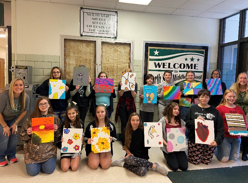 A group of eighth graders at North Star Middle School worked with Mrs. Harrington and Mrs. Senft to participate in a collaboration with The Positive Painting Project (based in Pittsburgh). Students attended a brief presentation that explained The Positive Painting Project, the importance of checking in on others and overall mental health awareness, and various coping strategies that can be used when students are struggling emotionally. Following the presentation, students were able to paint a canvas, which will be sent to The Positive Painting Project, have a positive message screen-printed on the front, and then be returned for display throughout the building.