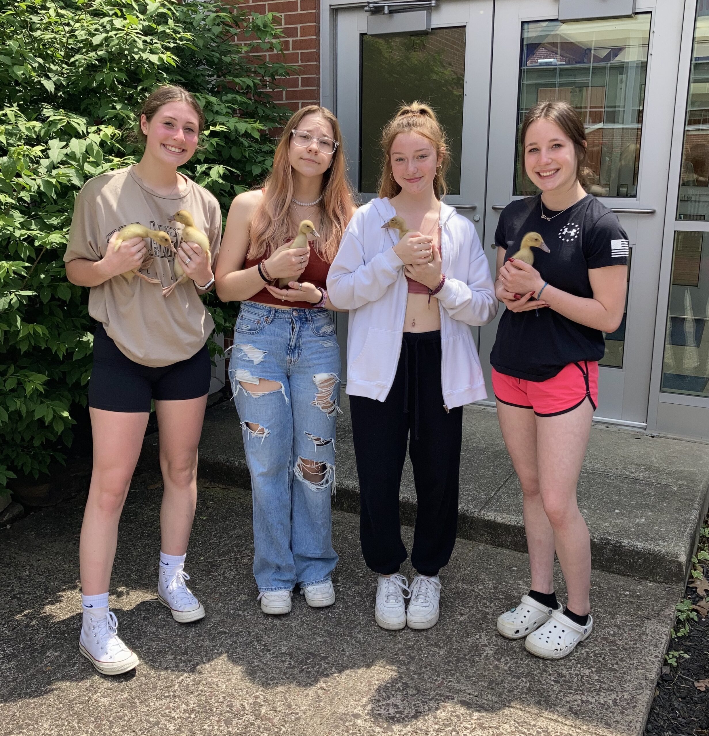Ava Gostonyi, Kylie Messinger, Alyssa Roe, and Jayden Gursky enjoy time in the courtyard with the ducks.Each year at Palmerton Area Senior High School, Mr. Justin Petersen and his Biology II students get fertilized duck eggs to incubate and hatch. Each lab group is assigned an egg, and they candle their egg each week. They hold it under a light to see the development of the embryo. They keep notes on their observations and catalog them throughout the process. Prior to the eggs hatch date, the students prepare the pen for the ducklings. Once the ducks are hatched, the students keep track of the growth for the couple of weeks. Once the ducks are old enough, they are placed in the high school’s courtyard when it is warm outside. This provides an opportunity for the entire student body to enjoy the ducklings as well. At the end of this school year, one of the high school teachers took the ducks home to live on her farm.