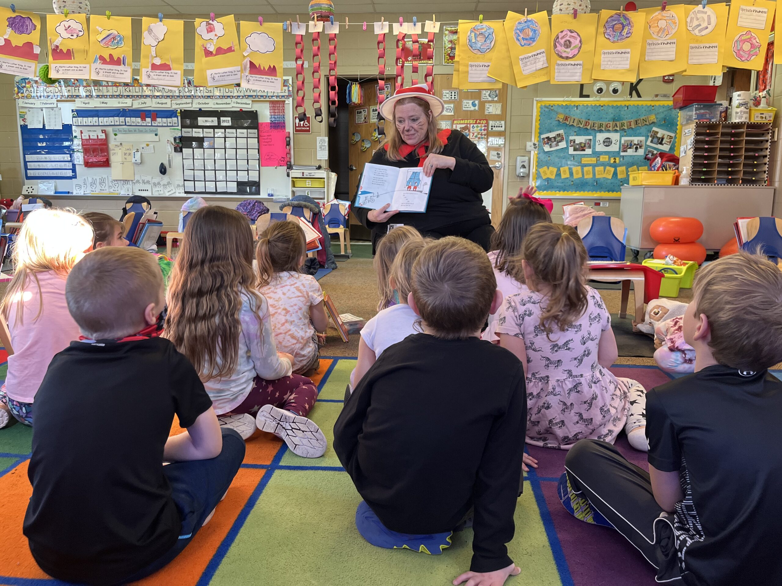 As soon as she walked into Kylie Kling’s kindergarten class, the students squealed in excitement with claps and jumps and bounces as they sat on the carpet listening to Dr. Seuss stories she read to them. Calling Green Eggs and Ham a memorable book, Correll said it was the first book she learned to read by herself as a child. She shared the book with the class that then worked with Kling on a word project that allowed students to tap into their inner Dr. Seuss with rhyme games and a craft. They were tasked with finishing the sentence, “I will not eat them on a…” with a rhyme such as “box with a fox” or “boat with a goat” and more.