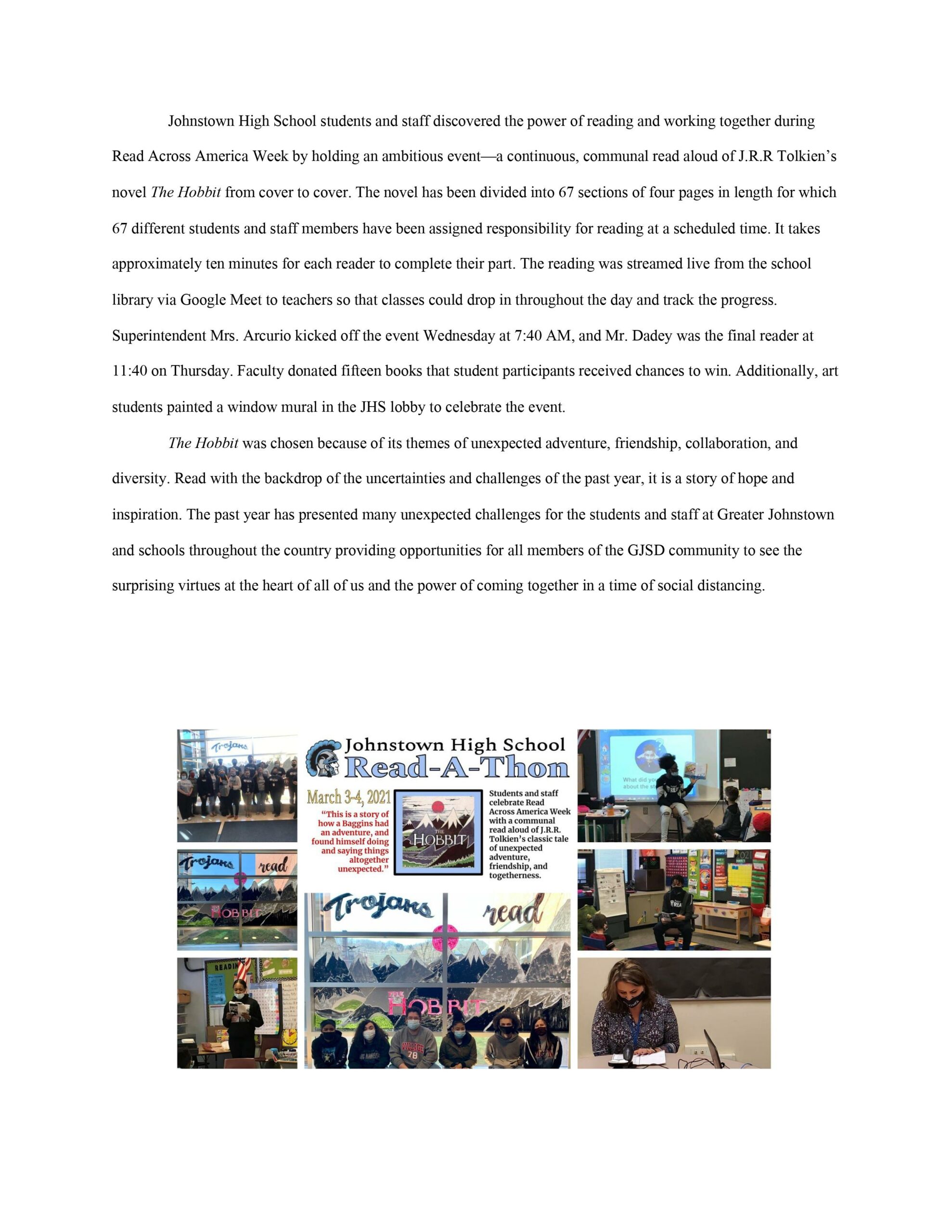 Greater Johnstown School District Read Across America with hope and inspiration during challenging timesJohnstown High School (JHS) students and staff discovered the power of reading and working together during Read Across America Week by holding an ambitious event — a continuous, communal read-aloud Read-A-Thon of J.R.R. Tolkien’s novel, The Hobbit, from cover to cover. In addition, a few JHS students visited the elementary school to read various selections for them, including original Black History Month poetry written by our own eighth grade students. Members of the JHS Interact Club refilled the group’s “red boxes” boxes placed around the community to provide free books to borrow in addition to nonperishable food items and cold-weather clothing such as coats and hats to those who need them.