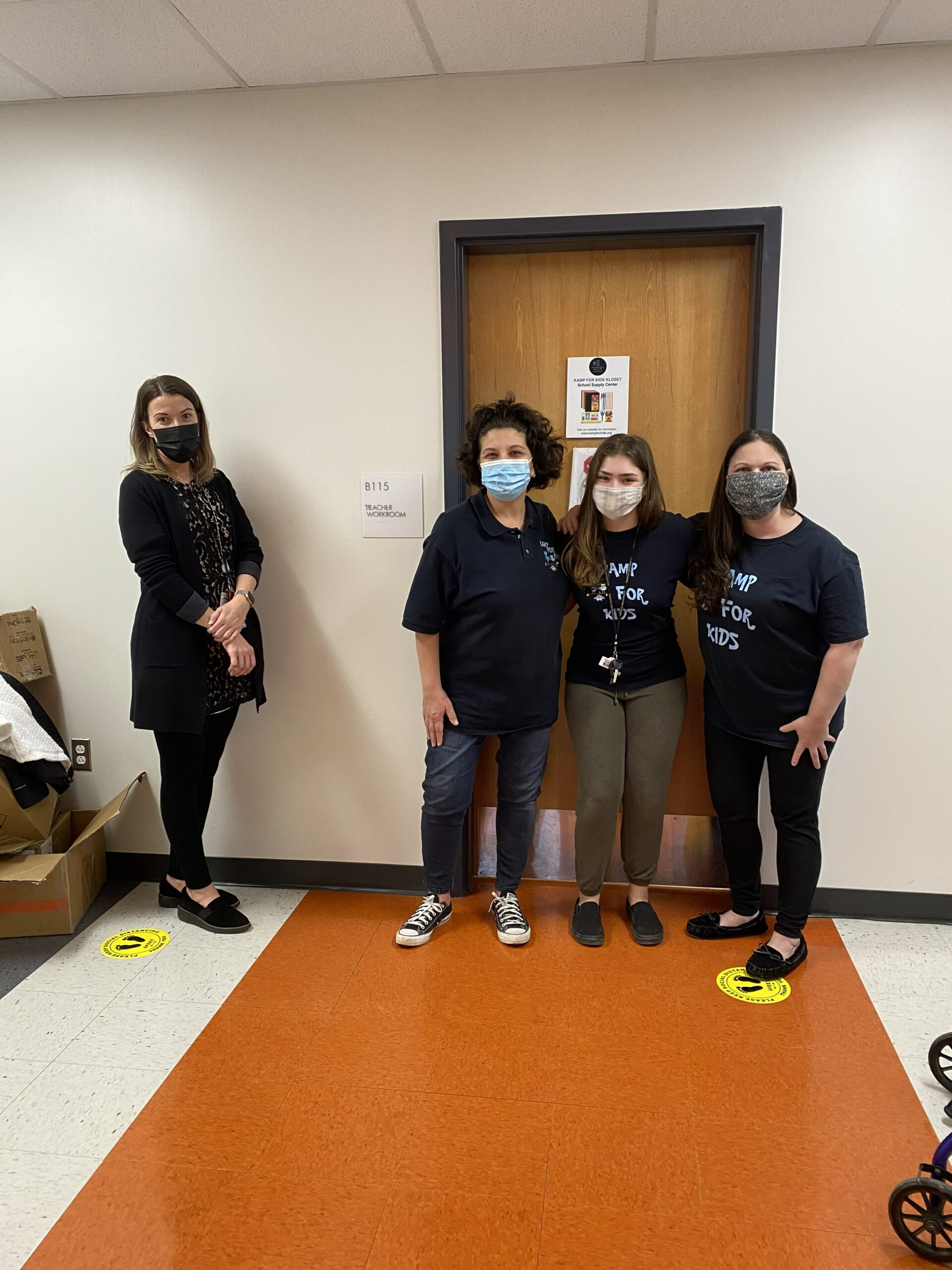 School social worker Joy Stickney-McDonald with Kamp For Kids staff Teresa McNamara, Penni Morton and her daughter Jessica Morton.Mill Creek Elementary School recently opened a donation room for students who are in need of school supplies, food and clothing. During the holiday months, Mill Creek Elementary School assisted families with holiday food and gifts. “When we returned in January, I thought ‘Why stop there?’” said Joy Stickney-McDonald MSS, LSW, school social worker. “I wanted to expand our efforts to a year-round service for our community.” This is when her vision of creating a school supply, food and clothing resource room was born.