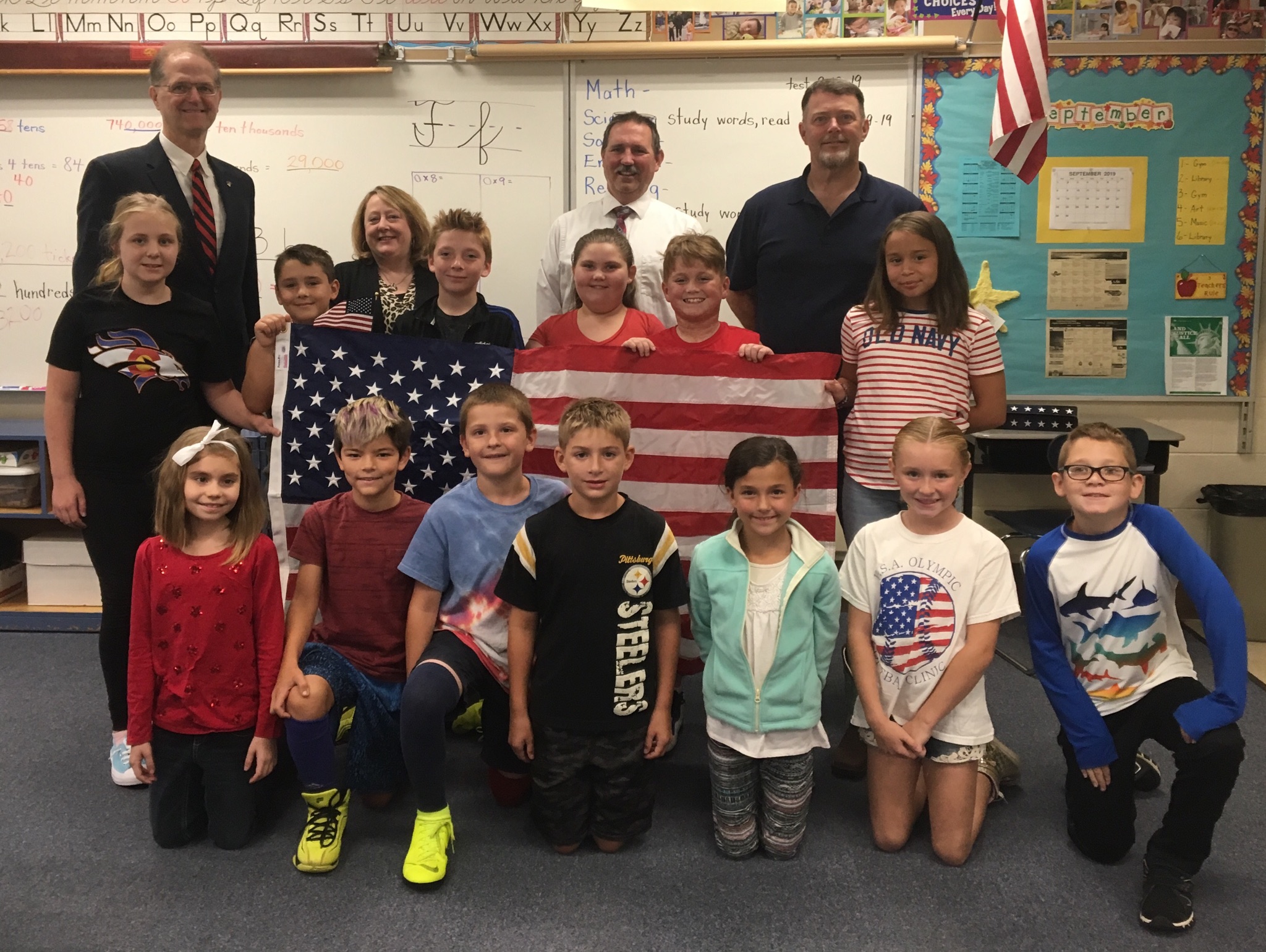 The students recently learned about Betsy Ross and the first American flag prior to his visit. Senator Hutchinson presented the school with a flag that hung in the State Capitol Building in Harrisburg.