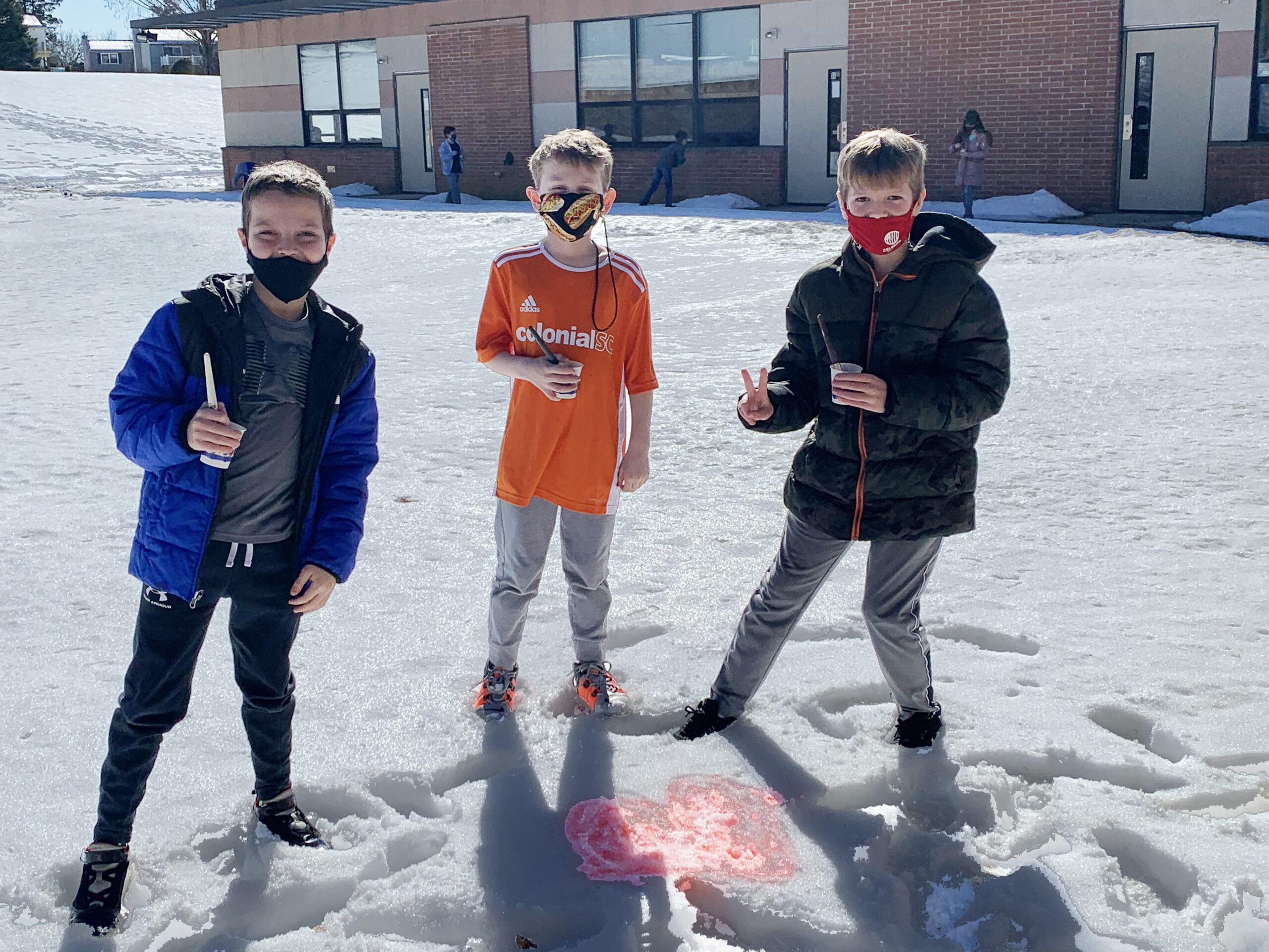 Whitemarsh Elementary Anthony D’Amore, Thomas Flanagan, and T.J. MartinWhitemarsh Elementary School third graders used the snow as their canvas to spread kindness to other classrooms this winter, thanks to an idea from their teacher, Kirsten Henry. Ms. Henry came up with the idea after seeing her neighbor “painting” outdoors with her daughter, using a mixture of water, cornstarch and food coloring. She thought the activity would be fun for her third grade class and presented the idea to her students as a way to spread kind messages to other classrooms and teachers for Valentine’s Day. But the weather didn’t quite cooperate and the activity had to be put off for a few weeks. Finally, nicer days arrived, and the students were able to sneak out to paint their kind messages on the snow outside Whitemarsh’s classroom windows. When they were done, faculty and staff were invited to look outside and see hearts, “X”s and “O”s, and other short sayings meant to make them feel special.