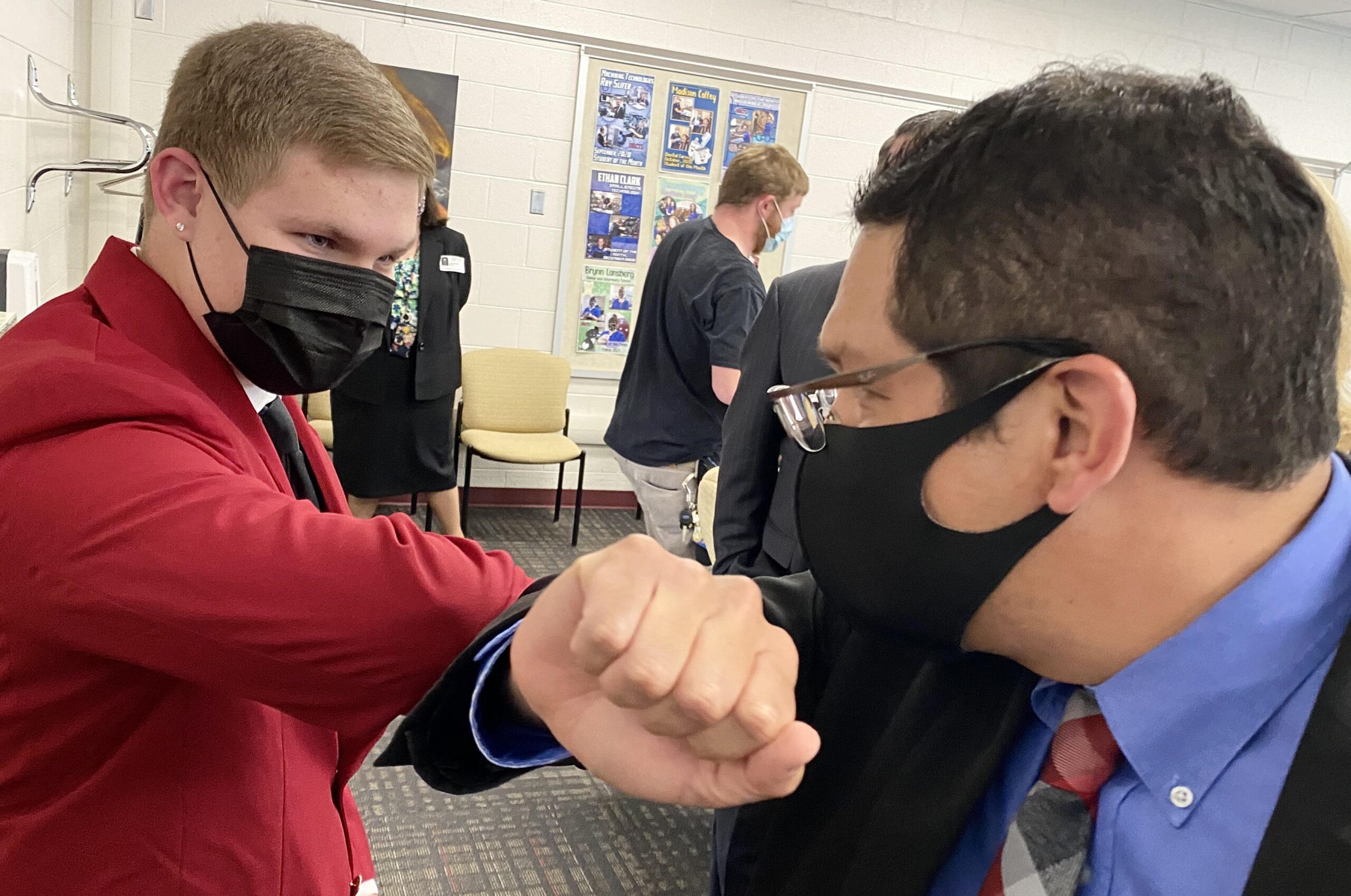 Presidential Scholar Raymond Slifer, left, elbow bumps with Acting Secretary of Education Noe Ortega during a visit to Upper Bucks County Technical School.Pennsylvania Department of Education Acting Secretary Noe Ortega visited the Upper Bucks County Technical School (UBCTS) on June 2 to recognize the “high accomplishments” of Presidential Scholar Raymond Slifer and tout the importance of career and technical education.