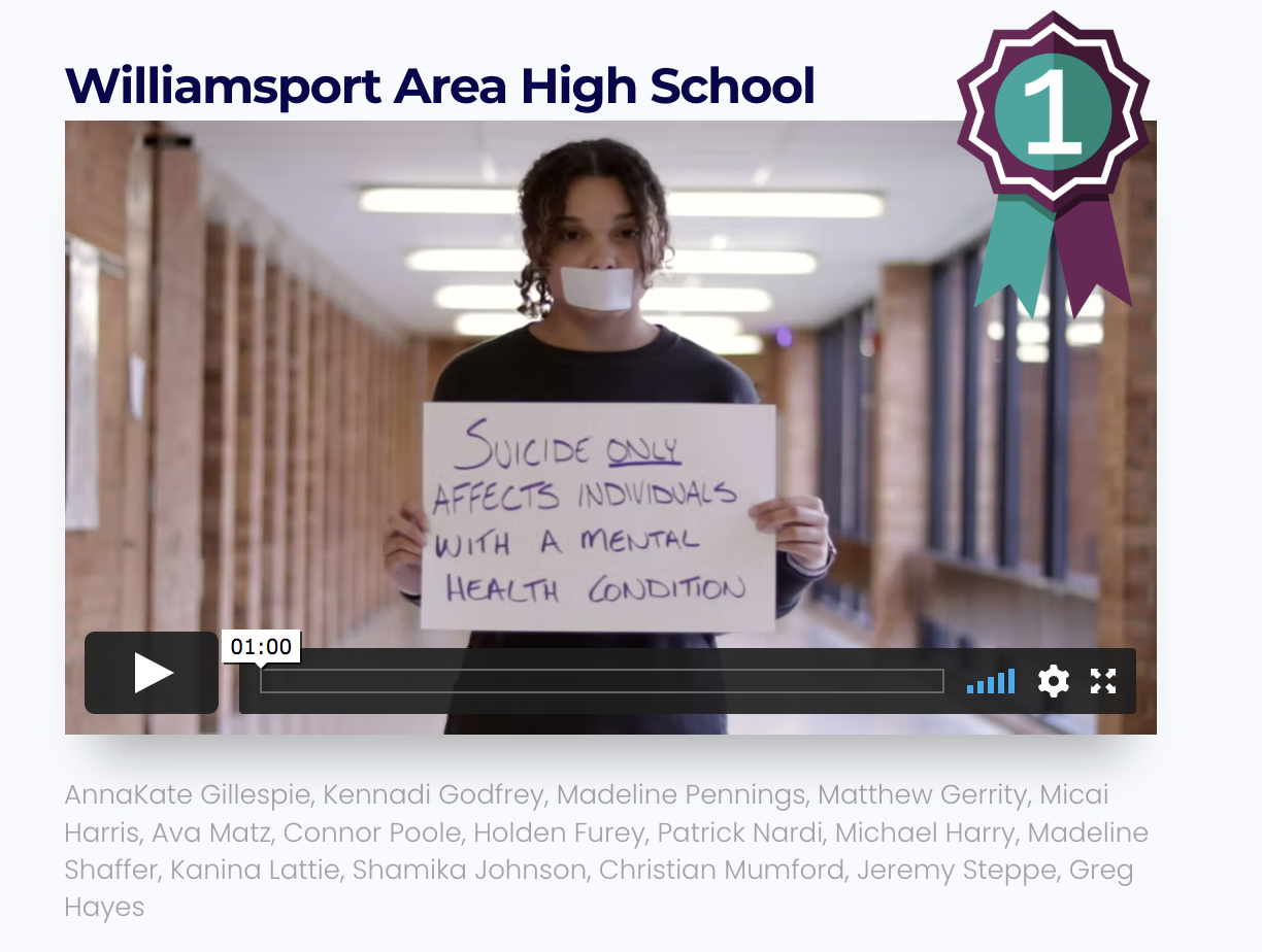 Screenshot of the winning video entryA Williamsport Area High School (WAHS) video produced to help raise awareness on mental health stigmas and suicide prevention received first place in a recent statewide PSA contest conducted by Prevent Suicide PA (PSPA). The video, created by members of the high school’s Students Against Destructive Decisions (SADD) Club, earned the top spot in the 60-second category through online votes received from both students and the broader public.