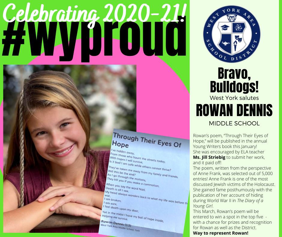 West York Area middle school student Rowan Dennis’ poem, “Through Their Eyes of Hope,” will be published in the annual Young Writers book this January! She was encouraged by West York Area Middle School ELA teacher Ms. Jill Striebig to submit her work, and it paid off!