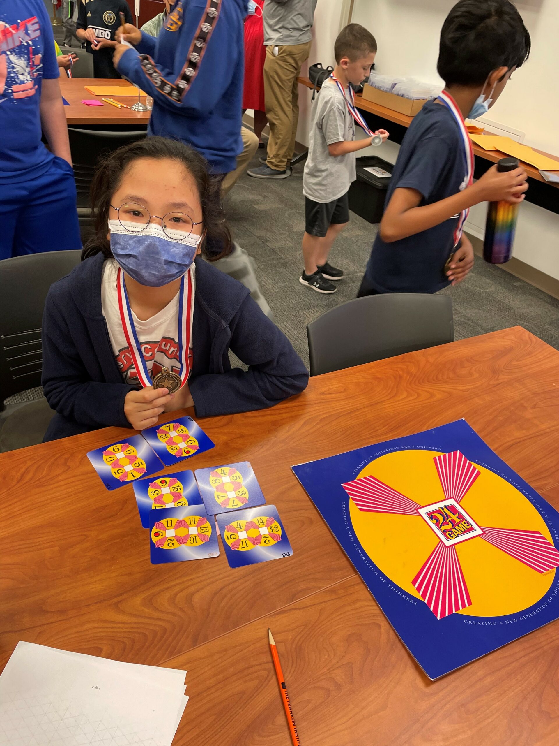Angie Lee after winning the Math 24 TournamentAngie Lee, a fifth grade student at Simmons Elementary School, won the Montgomery County Math 24 Tournament held on May 26, 2022. In the Math 24 game, players are shown cards with four numbers on them and need to make the number 24 by adding, subtracting, multiplying and dividing. Each number must be used, but each number can be used only once. Beyond strengthening procedural fluency, the Math 24 game expands strategic thinking and adaptive reasoning abilities, laying the groundwork for higher-order math skills.