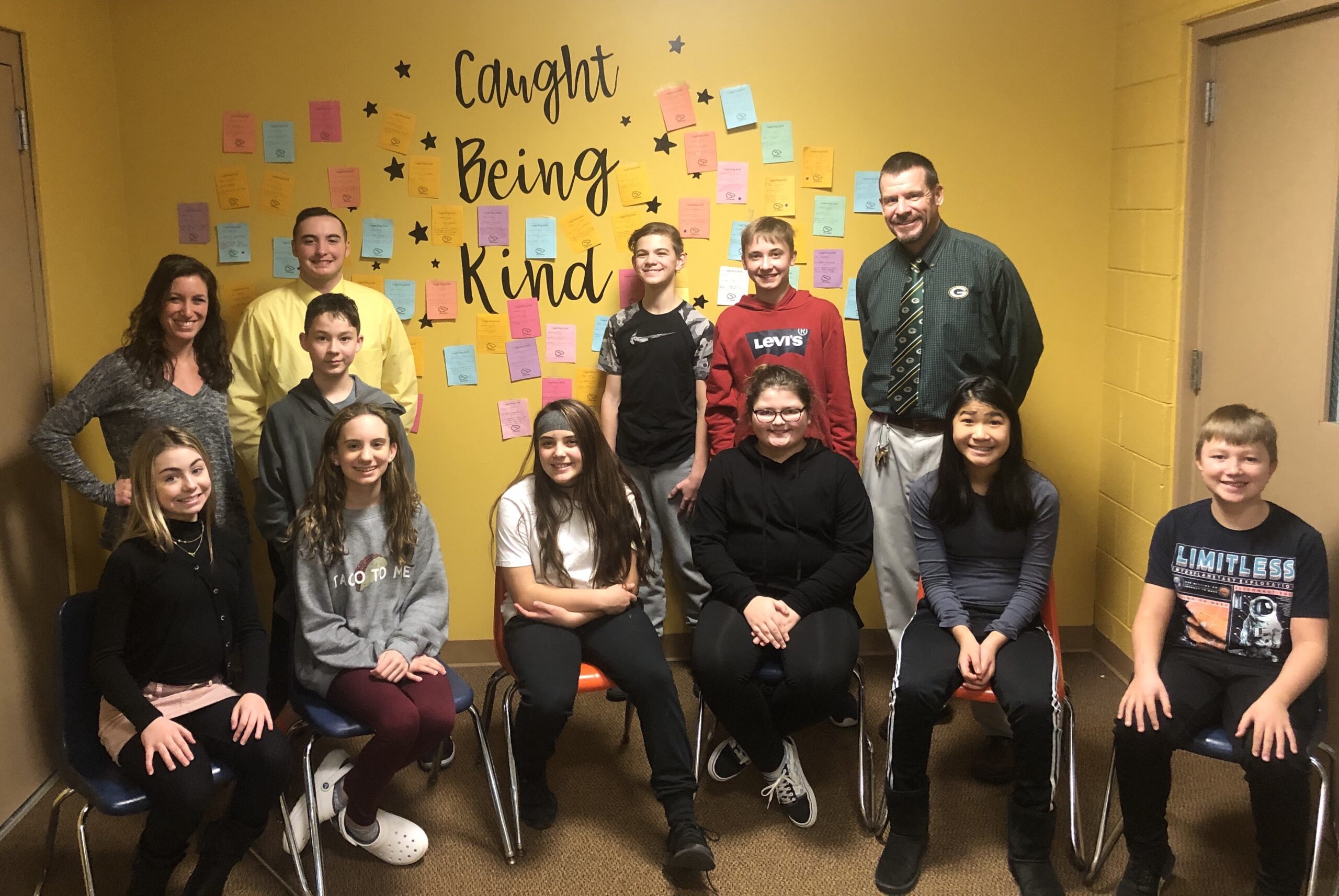 The program is run by Mrs. Wentroble, the School Counselor. Our Caught Being Kind winners from the first half of the school year (seated L-R): Ayda Robinson, Allison Krier, Emma Sanford, Lacey Carter, Kristin Sutherland, Yuriy Bidochko, (standing L-R) Mrs. Wentroble, Chuckie Fontana, Matt Hippler, Aaron Burdell, Nick Turowski, and Mr. Steele.