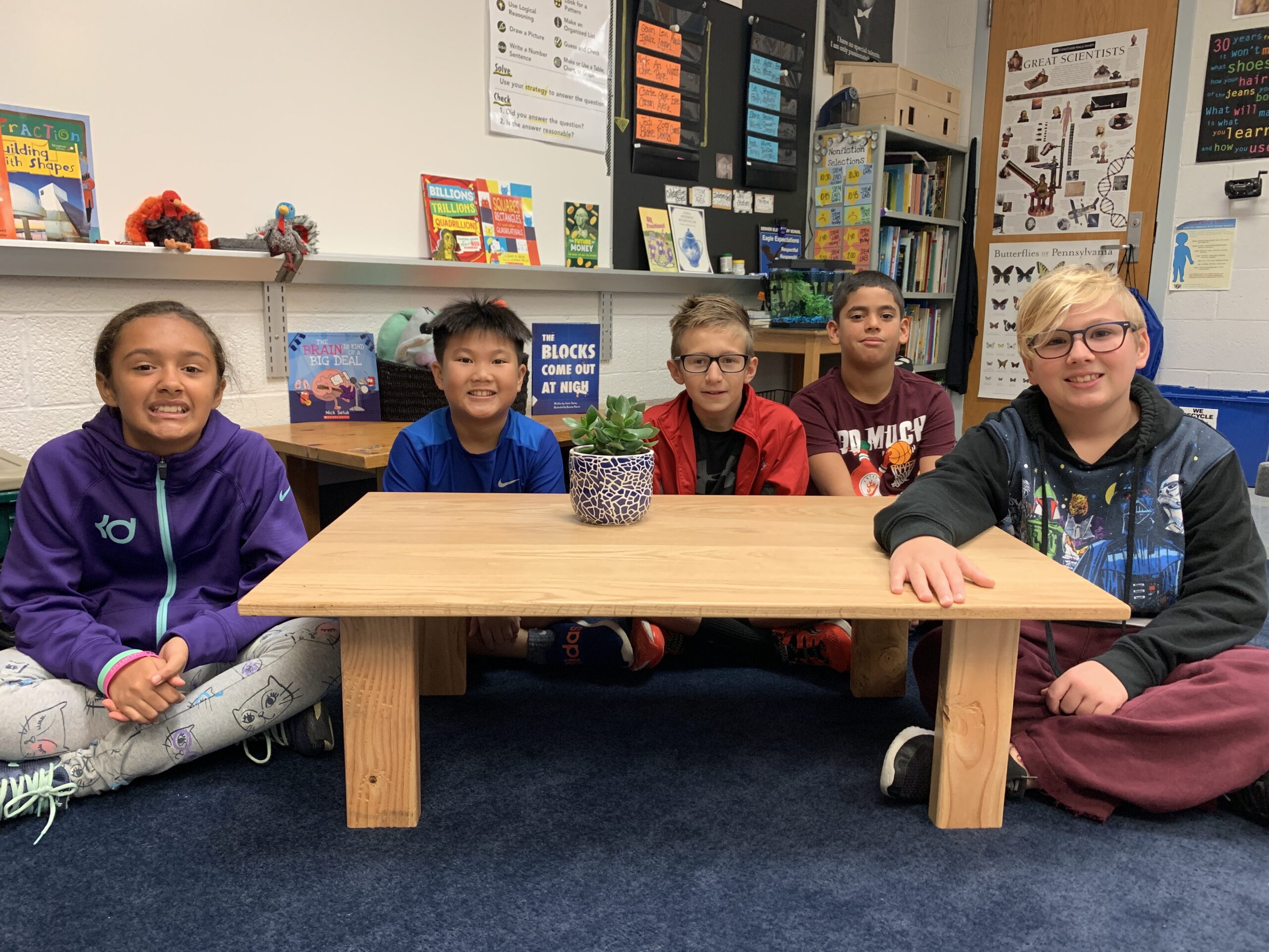 During the 2018-19 school year, Denver Elementary hosted a morning “Brain Builders” group for fourth and fifth graders who benefited from additional academic support. The group’s facilitators talked about providing the Brain Builders an opportunity to apply the steps in the Engineering Design Process with a real-world experience. They started the EDP process by asking students: “What could Brain Builders design that would improve learning in our school?” After imagining all the possibilities, the children agreed that “little tables” should be made so that students could get away from their desks during collaborative centers and work together on the floor. Their plan originated from their experiences working at a little table in Mrs. Lutz’s STEM lab. They settled on a project that had already been invented by another person, naming their design after the original builder, a retired teacher and administrator, Dr. Robert Hamilton.