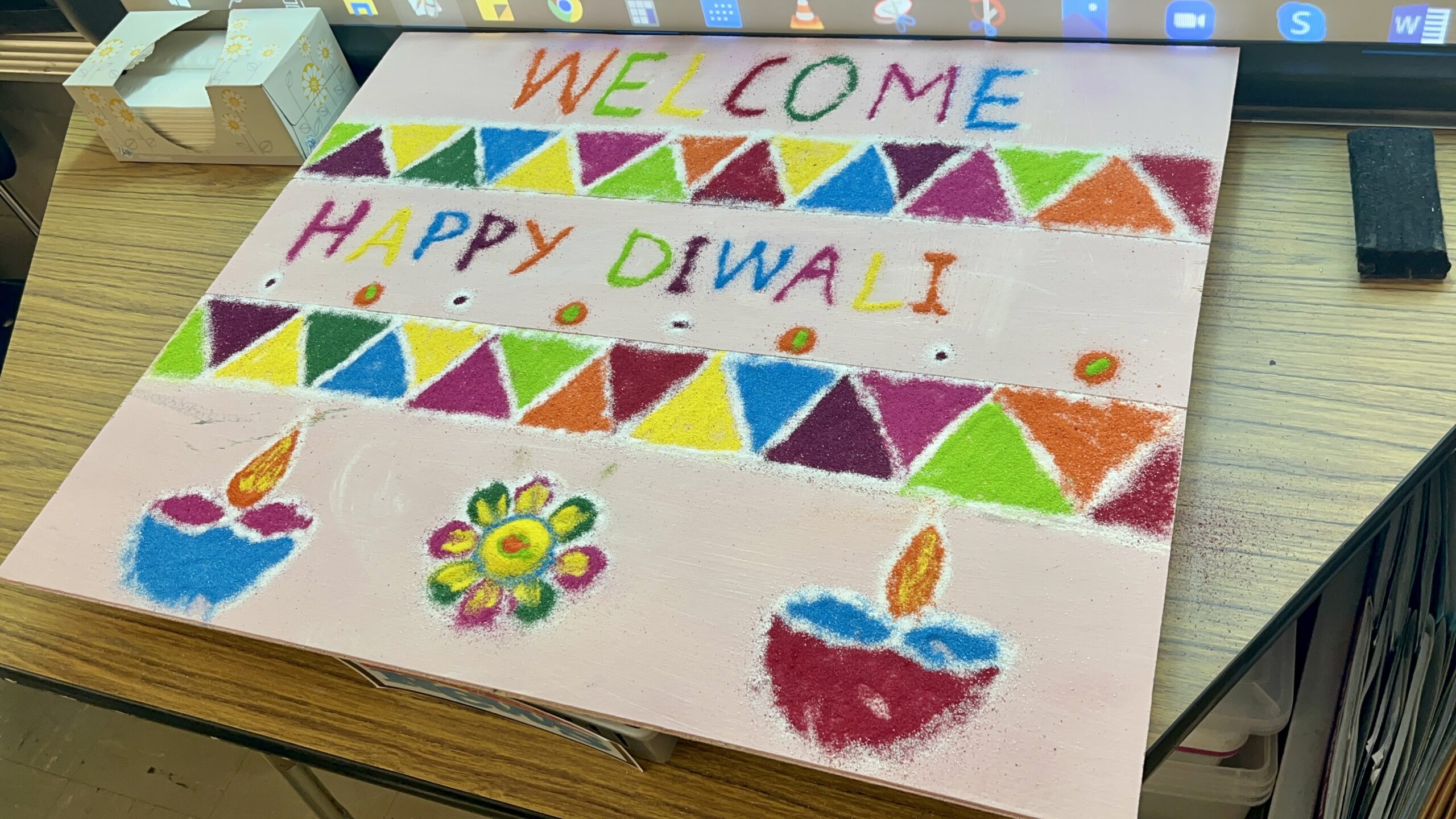 Students have also been making accompanying crafts that complement the holiday lessons such as rangoli, or sand art, and the Star of David made of pipe cleaners.
