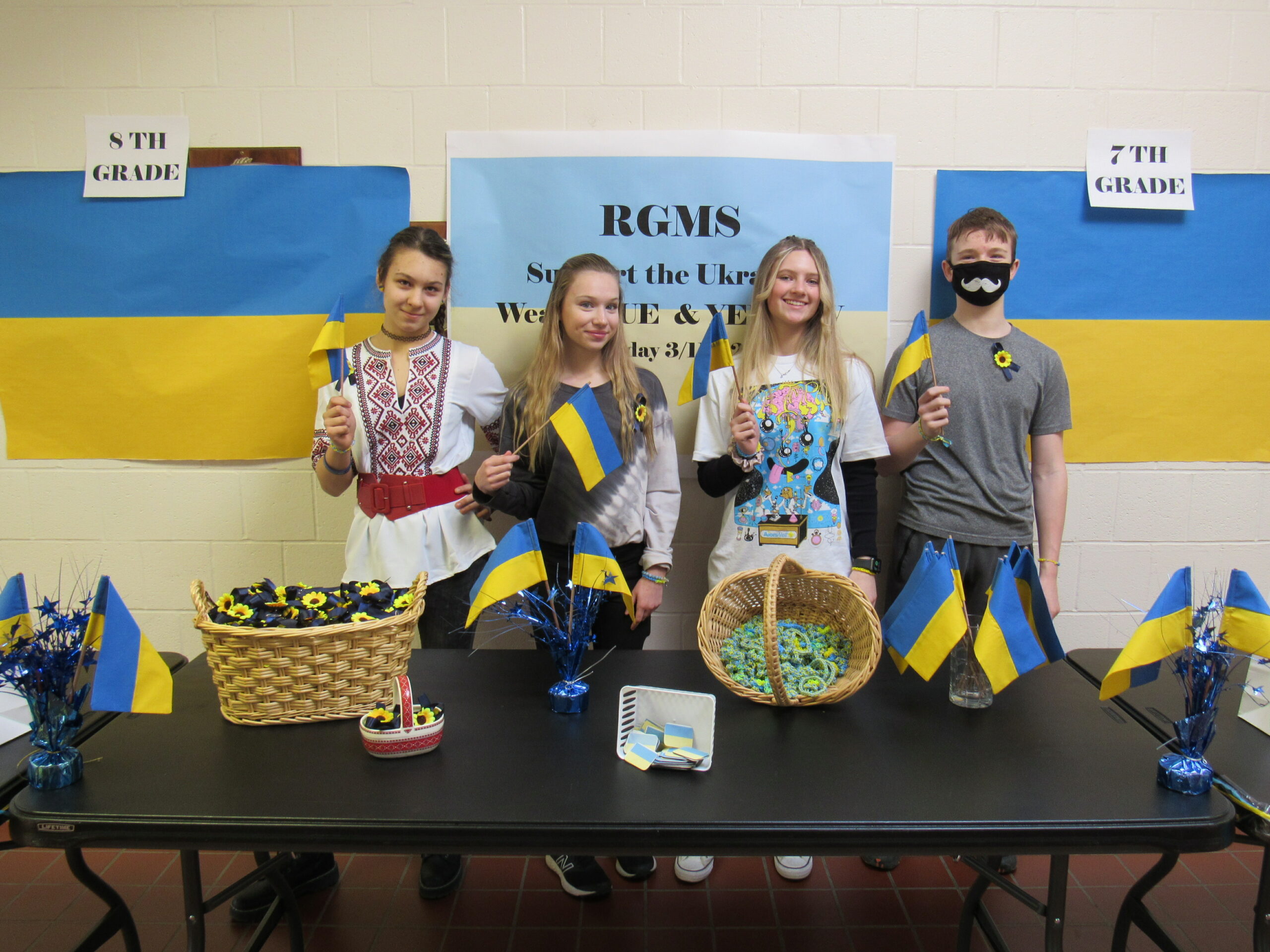 (L-R): Alisa Yeremenko, Annika Kyyashko, Daniela Tyrpak and Walter Killey spearheaded a schoolwide fundraiser, March 10-11, as a way to support humanitarian efforts in Ukraine.The namesake of Ryan Gloyer Middle School (RGMS) would be immensely proud of four RGMS students who recently united to help a greater cause. A group of Ukrainian-descent students, including Walter Killey, Annika Kyyashko, Daniela Tyrpak and Alisa Yeremenko, spearheaded a school-wide fundraiser, March 10-11, as a way to support humanitarian efforts in Ukraine.