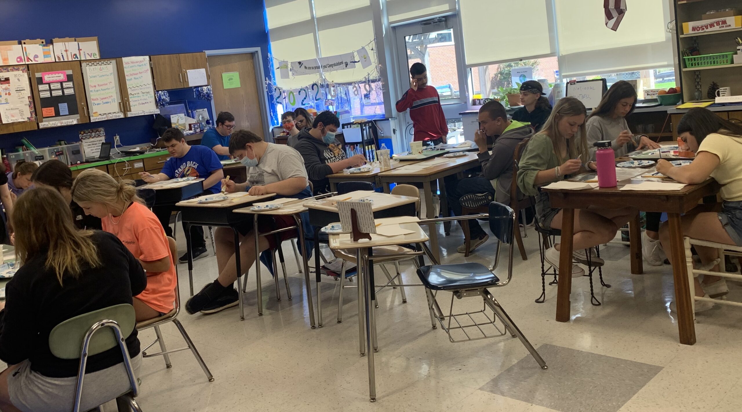 Students participated in this year’s Buddies Club painting party at Palmerton Area Senior High School.When Palmerton Area Senior High School opened its own high school life skills program for grades 9-12 and 18-21-year-olds, life skills teacher, Miss Mandy Cappella, saw a need for a social activity club. This club would allow the life skills students to engage in practical, everyday activities with peers from the student body. The Buddies Club has grown steadily since its inception in 2019. The group meets once a month and engages in activities such as playing board games, cooking, baking, holiday celebrations and art projects.